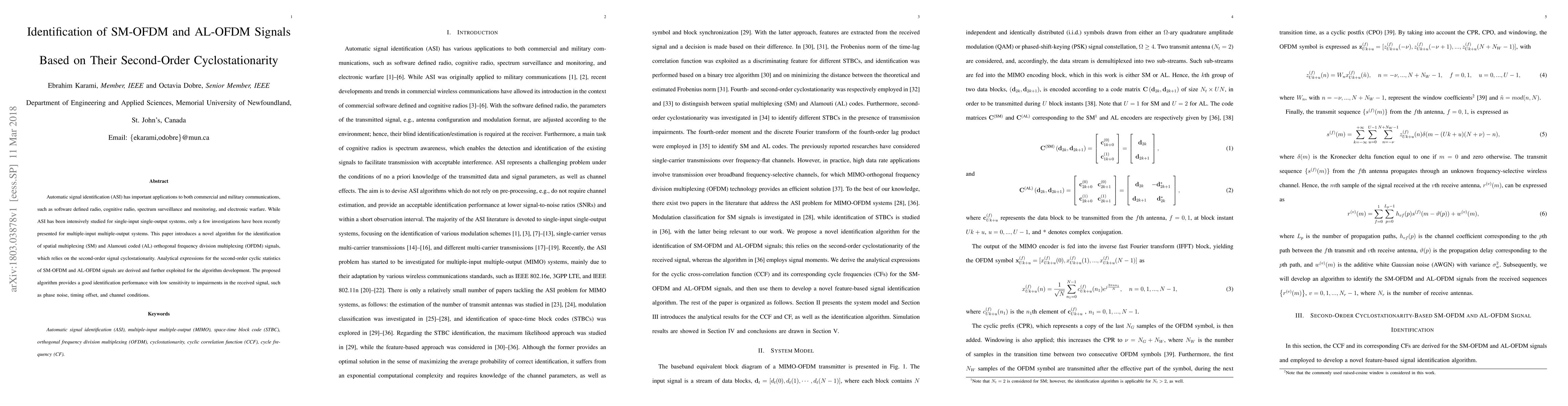 The paper presents a novel algorithm for identifying SM-OFDM and AL-OFDM signals based on their second-order cyclostationarity, deriving analytical expressions for their second-order cyclic statistics.