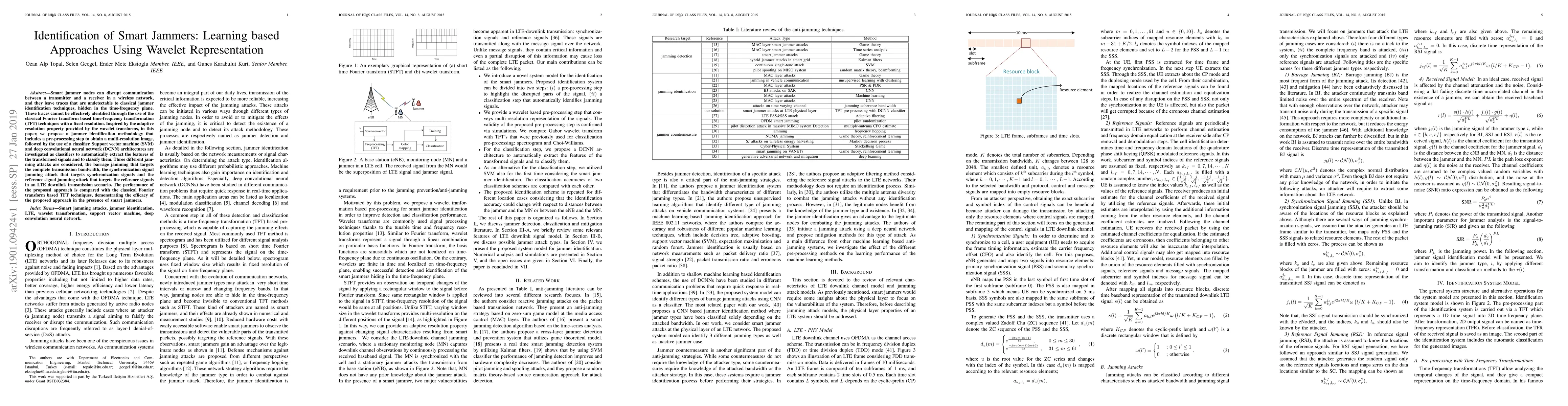 Smart jammer nodes can disrupt communication between a transmitter and a receiver in a wireless network, and they leave traces that are undetectable to classical jammer identification techniques, hidden in the time-frequency plane. These traces cannot be effectively identified through the use of the classical Fourier transform based time-frequency transformation (TFT) techniques with a fixed resolution. Inspired by the adaptive resolution property provided by the wavelet transforms, in this paper, we propose a jammer identification methodology that includes a pre-processing step to obtain a multi-resolution image, followed by the use of a classifier. Support vector machine (SVM) and deep convolutional neural network (DCNN) architectures are investigated as classifiers to automatically extract the features of the transformed signals and to classify them. Three different jamming attacks are considered, the barrage jamming that targets the complete transmission bandwidth, the synchronization signal jamming attack that targets synchronization signals and the reference signal jamming attack that targets the reference signals in an LTE downlink transmission scenario. The performance of the proposed approach is compared with the classical Fourier transform based TFT techniques, demonstrating the efficacy of the proposed approach in the presence of smart jammers.