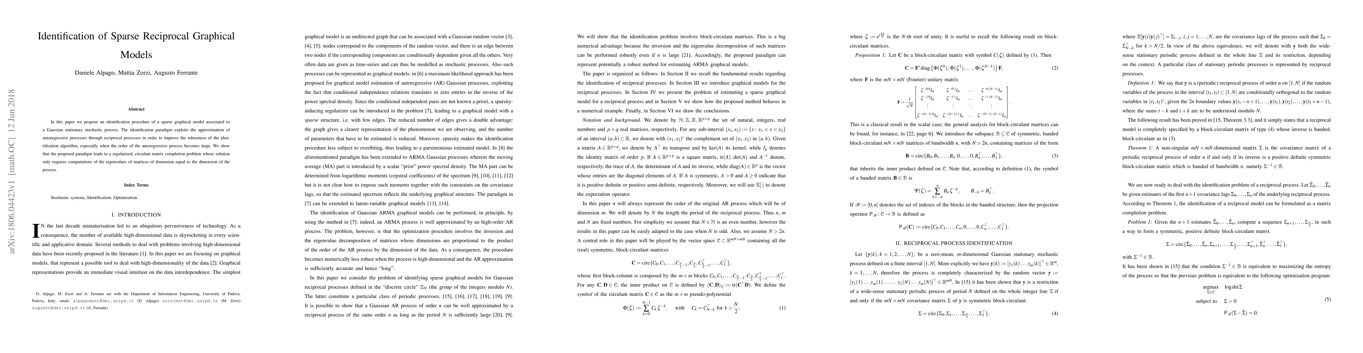 This paper introduces an identification method for sparse graphical models linked to Gaussian stationary stochastic processes, utilizing reciprocal processes to enhance the robustness of the algorithm, especially for high-order autoregressive processes. The method results in a regularized, circulant matrix completion problem solvable via eigenvalue computations of matrices of the same dimension as the process.