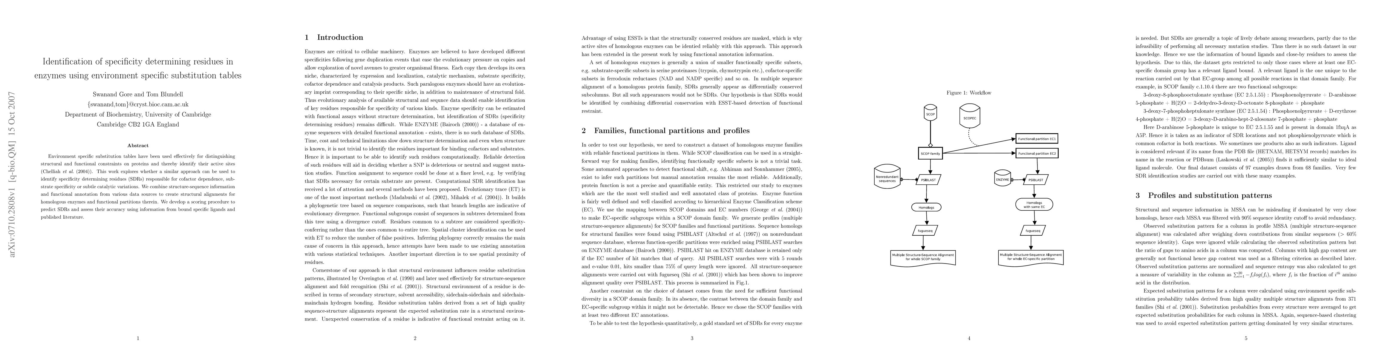 Environment specific substitution tables have been used effectively for distinguishing structural and functional constraints on proteins and thereby identify their active sites (Chelliah et al. (2004)). This work explores whether a similar approach can be used to identify specificity determining residues (SDRs) responsible for cofactor dependence, substrate specificity or subtle catalytic variations. We combine structure-sequence information and functional annotation from various data sources to create structural alignments for homologous enzymes and functional partitions therein. We develop a scoring procedure to predict SDRs and assess their accuracy using information from bound specific ligands and published literature.
