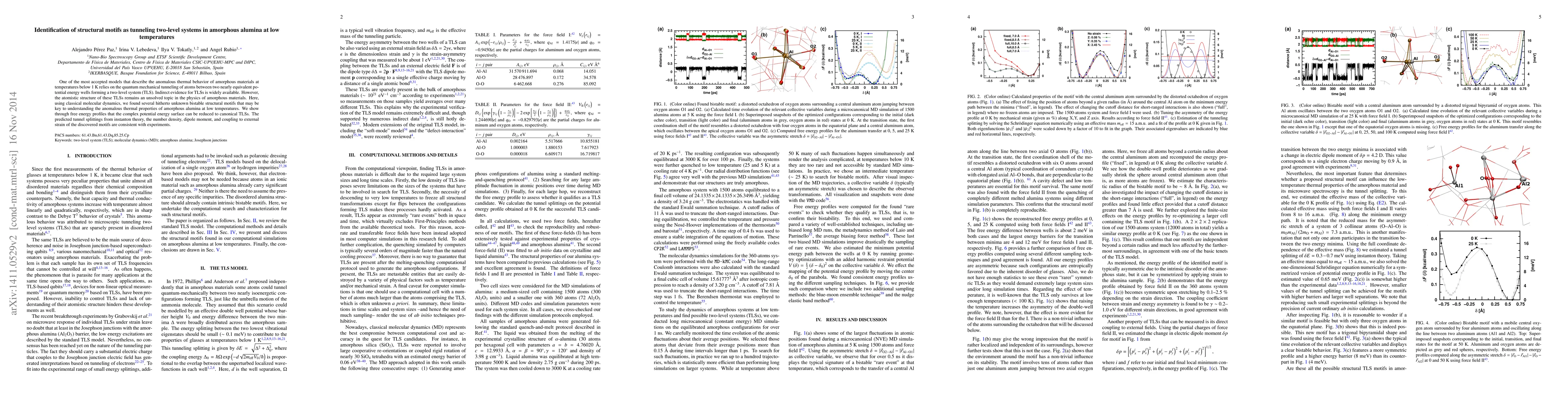 One of the most accepted models that describe the anomalous thermal behavior of amorphous materials at temperatures below 1 K relies on the quantum mechanical tunneling of atoms between two nearly equivalent potential energy wells forming a two-level system (TLS). Indirect evidence for TLSs is widely available. However, the atomistic structure of these TLSs remains an unsolved topic in the physics of amorphous materials. Here, using classical molecular dynamics, we found several hitherto unknown bistable structural motifs that may be key to understanding the anomalous thermal properties of amorphous alumina at low temperatures. We show through free energy profiles that the complex potential energy surface can be reduced to canonical TLSs. The predicted tunnel splittings from instanton theory, the number density, dipole moment, and coupling to external strain of the discovered motifs are consistent with experiments.