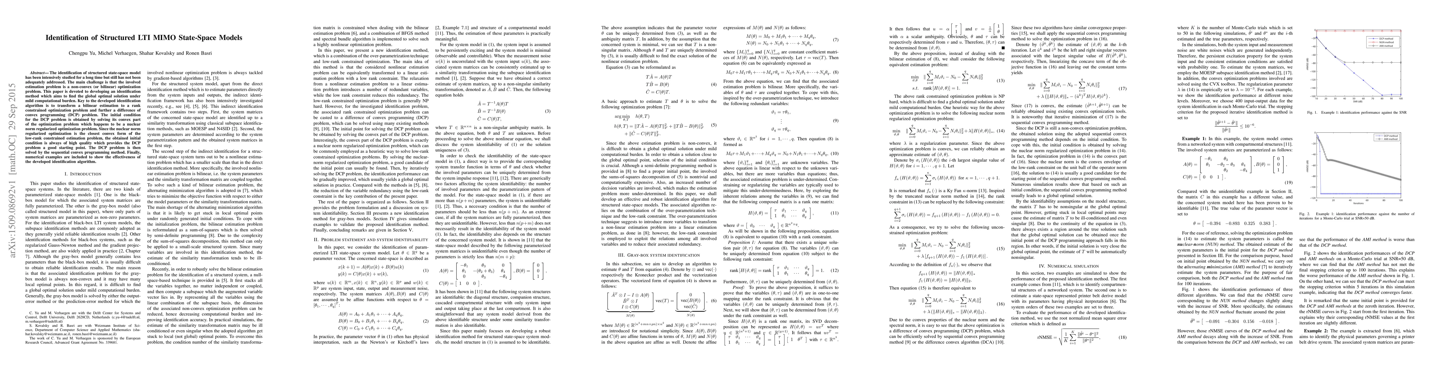 This paper develops an identification method for structured LTI MIMO state-space models by transforming a bilinear estimation problem into a rank-constrained optimization problem and a difference of convex programming (DCP) problem. The DCP problem is solved using sequential convex programming, with a high-quality initial condition derived from nuclear norm regularized optimization. Numerical examples demonstrate the effectiveness of the proposed algorithm.