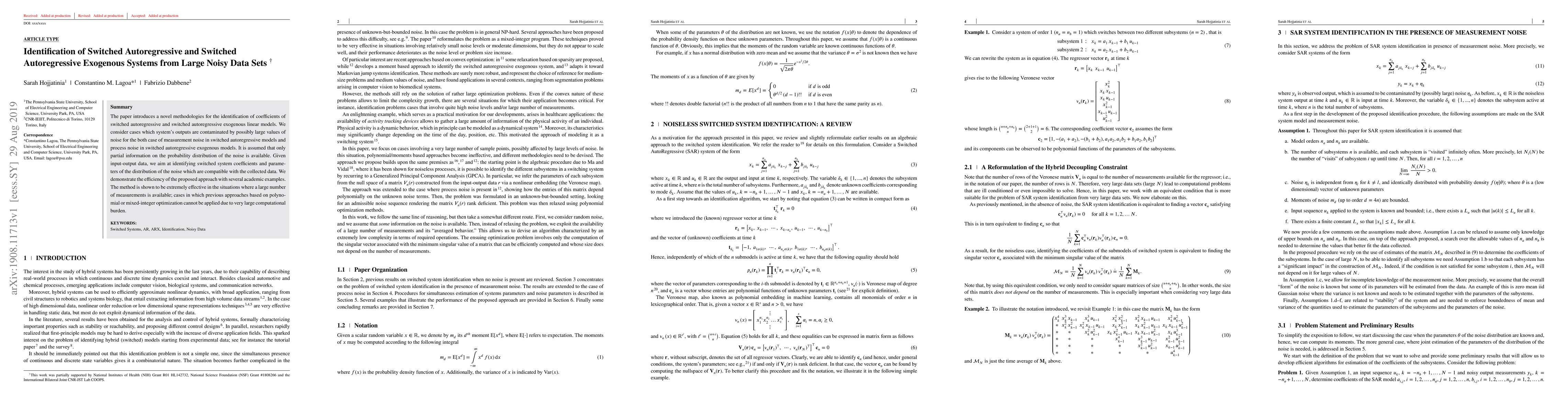 The paper introduces novel methodologies for the identification of coefficients of switched autoregressive and switched autoregressive exogenous linear models. We consider cases which system's outputs are contaminated by possibly large values of noise for the both case of measurement noise in switched autoregressive models and process noise in switched autoregressive exogenous models. It is assumed that only partial information on the probability distribution of the noise is available. Given input-output data, we aim at identifying switched system coefficients and parameters of the distribution of the noise, which are compatible with the collected data. We demonstrate the efficiency of the proposed approach with several academic examples. The method is shown to be extremely effective in the situations where a large number of measurements is available; cases in which previous approaches based on polynomial or mixed-integer optimization cannot be applied due to very large computational burden.