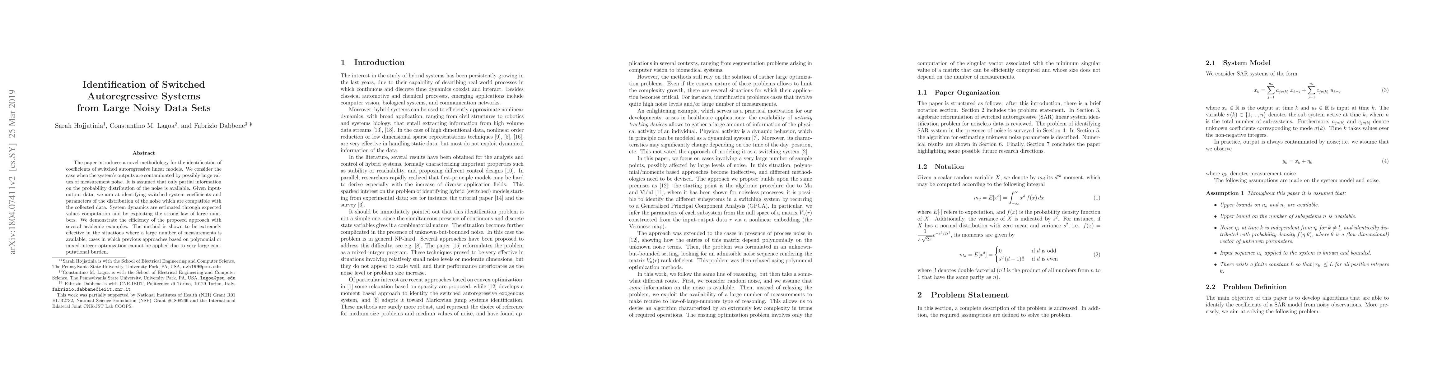 The paper introduces a novel methodology for the identification of coefficients of switched autoregressive linear models. We consider the case when the system's outputs are contaminated by possibly large values of measurement noise. It is assumed that only partial information on the probability distribution of the noise is available. Given input-output data, we aim at identifying switched system coefficients and parameters of the distribution of the noise which are compatible with the collected data. System dynamics are estimated through expected values computation and by exploiting the strong law of large numbers. We demonstrate the efficiency of the proposed approach with several academic examples. The method is shown to be extremely effective in the situations where a large number of measurements is available; cases in which previous approaches based on polynomial or mixed-integer optimization cannot be applied due to very large computational burden.