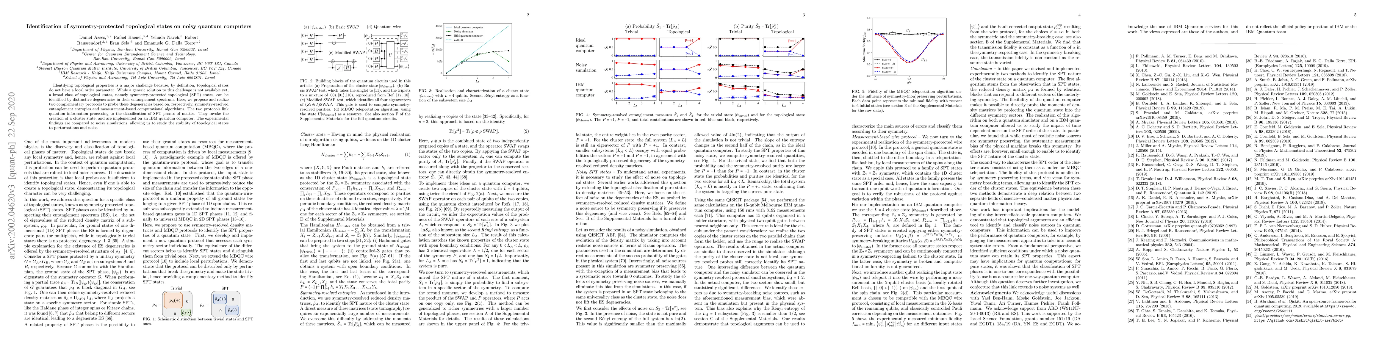 Identifying topological properties is a major challenge because, by definition, topological states do not have a local order parameter. While a generic solution to this challenge is not available yet, a broad class of topological states, namely symmetry-protected topological (SPT) states, can be identified by distinctive degeneracies in their entanglement spectrum. Here, we propose and realize two complementary protocols to probe these degeneracies based on, respectively, symmetry-resolved entanglement entropies and measurement-based computational algorithms. The two protocols link quantum information processing to the classification of SPT phases of matter. They invoke the creation of a cluster state, and are implemented on an IBM quantum computer. The experimental findings are compared to noisy simulations, allowing us to study the stability of topological states to perturbations and noise.