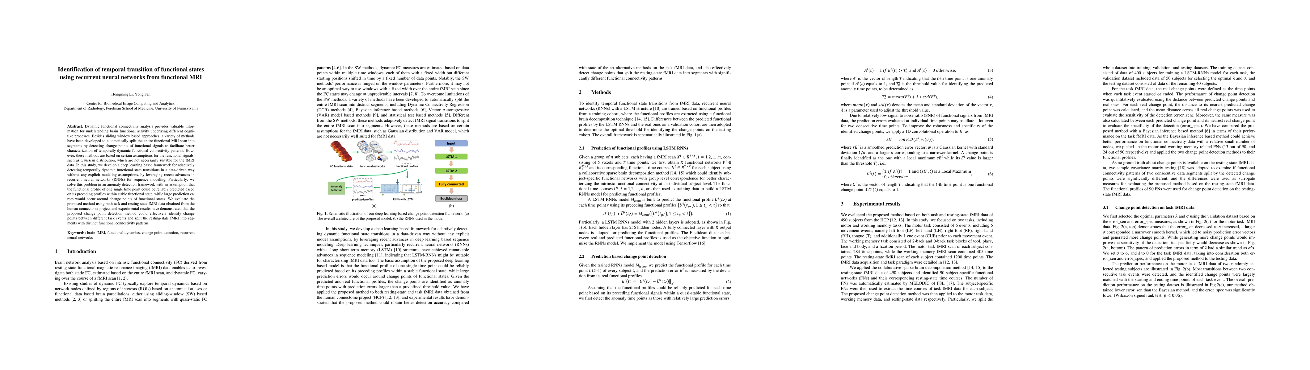 This paper proposes a deep learning framework using recurrent neural networks (RNNs) to detect temporal transitions in functional states from fMRI data without relying on traditional assumptions like Gaussian distribution. The method evaluates change points based on prediction errors, demonstrating effective identification of transitions in both task and resting-state fMRI data.