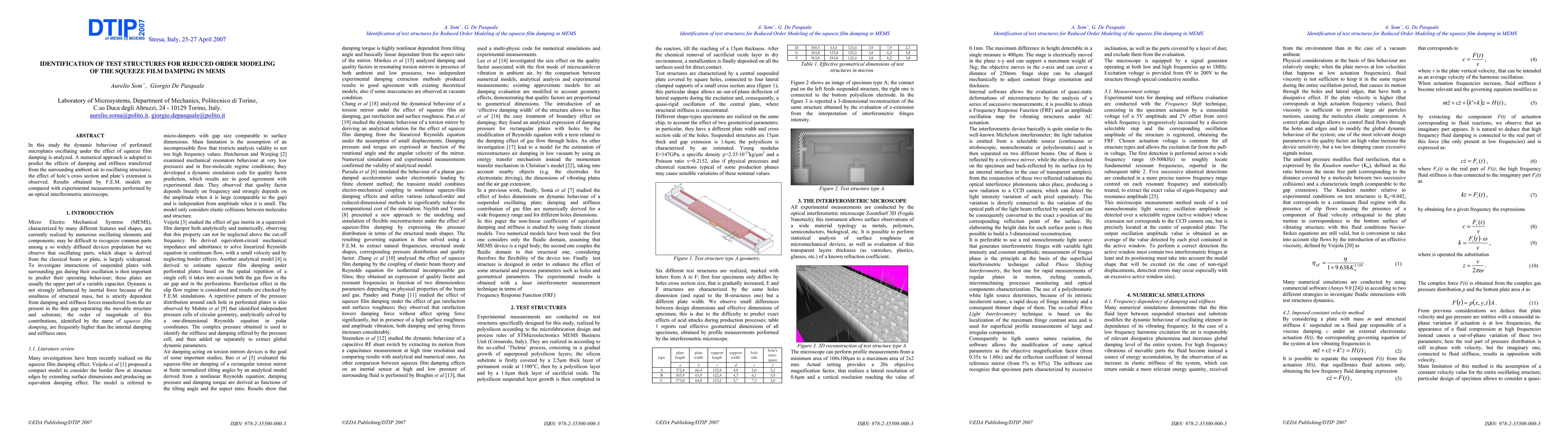 In this study the dynamic behaviour of perforated microplates oscillating under the effect of squeeze film damping is analyzed. A numerical approach is adopted to predict the effects of damping and stiffness transferred from the surrounding ambient air to oscillating structures ; the effect of hole's cross section and plate's extension is observed. Results obtained by F.E.M. models are compared with experimental measurements performed by an optical interferometric microscope.