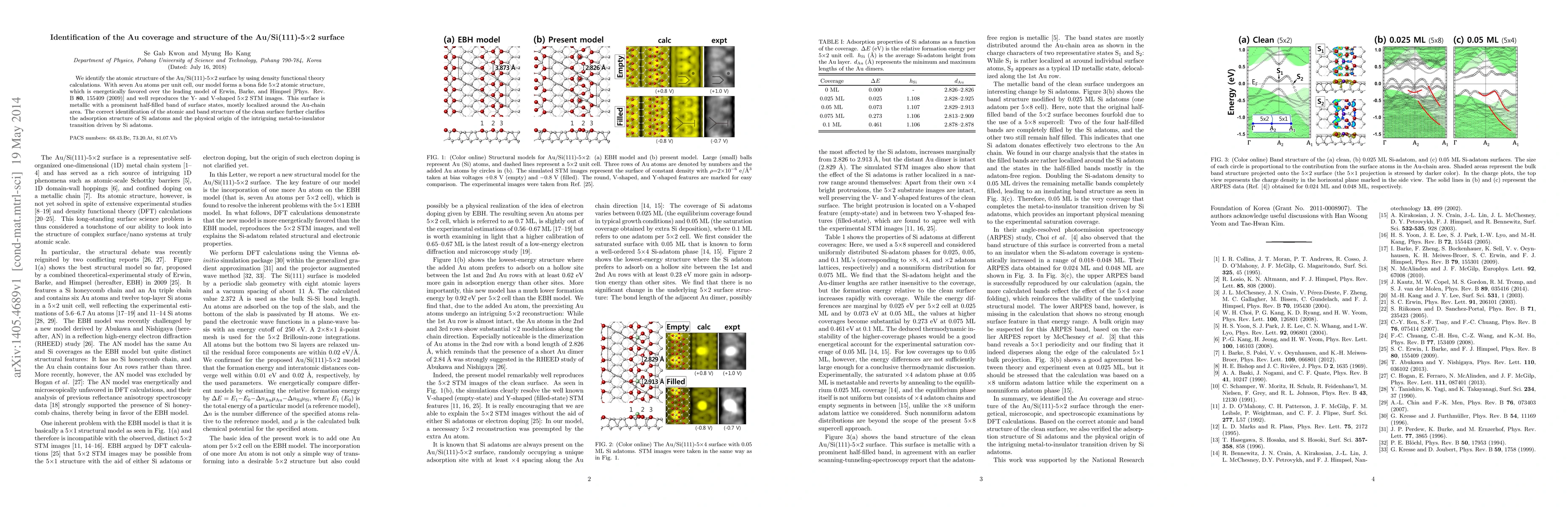Summary: Using density functional theory, researchers identified a seven-Au atom per unit cell 5x2 atomic structure for the Au/Si(111) surface, which is energetically favored and reproduces STM images, elucidating the surface's metallic nature and the effects of Si adatoms on its properties.