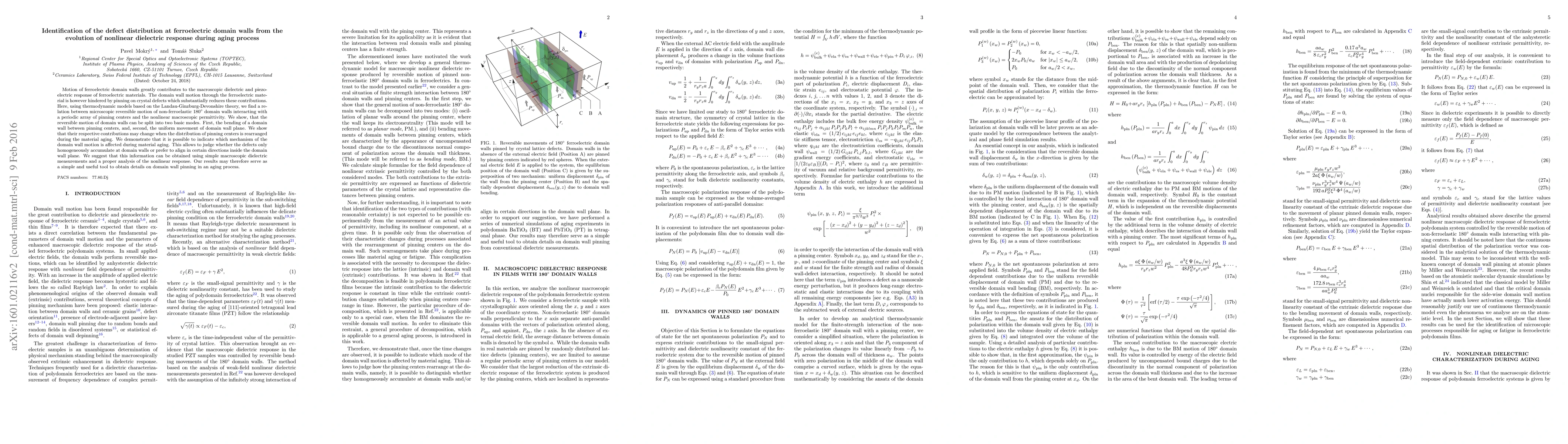 Motion of ferroelectric domain walls greatly contributes to the macroscopic dielectric and piezoelectric response of ferroelectric materials. The domain wall motion through the ferroelectric material is however hindered by pinning on crystal defects which substantially reduces these contributions. Here, using thermodynamic models based on the Landau-Ginzburg-Devonshire theory, we find a relation between microscopic reversible motion of non-ferroelastic 180-degree domain walls interacting with a periodic array of pinning centers and the nonlinear macroscopic permittivity. We show, that the reversible motion of domain walls can be split into two basic modes. First, the bending of a domain wall between pinning centers, and, second, the uniform movement of domain wall plane. We show that their respective contributions may change when the distribution of pinning centers is rearranged during the material aging. We demonstrate that it is possible to indicate which mechanism of the domain wall motion is affected during material aging. This allows to judge whether the defects only homogeneously accumulate at domain walls or prefer to align in certain directions inside the domain wall plane. We suggest that this information can be obtained using simple macroscopic dielectric measurements and a proper analysis of the nonlinear response. Our results may therefore serve as a simple and useful tool to obtain details on domain wall pinning in an aging process.
