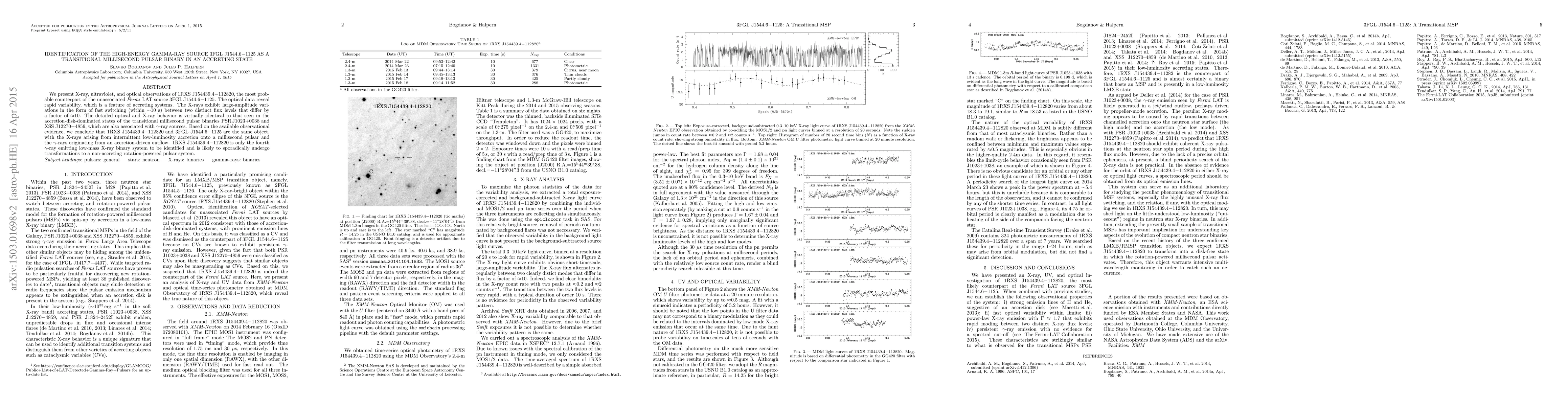 This paper identifies the high-energy gamma-ray source 3FGL J1544.6-1125 as a transitional millisecond pulsar binary in an accreting state, based on X-ray, ultraviolet, and optical observations showing rapid variability and intermittent low-luminosity accretion. It is the fourth such gamma-ray emitting low-mass X-ray binary system.
