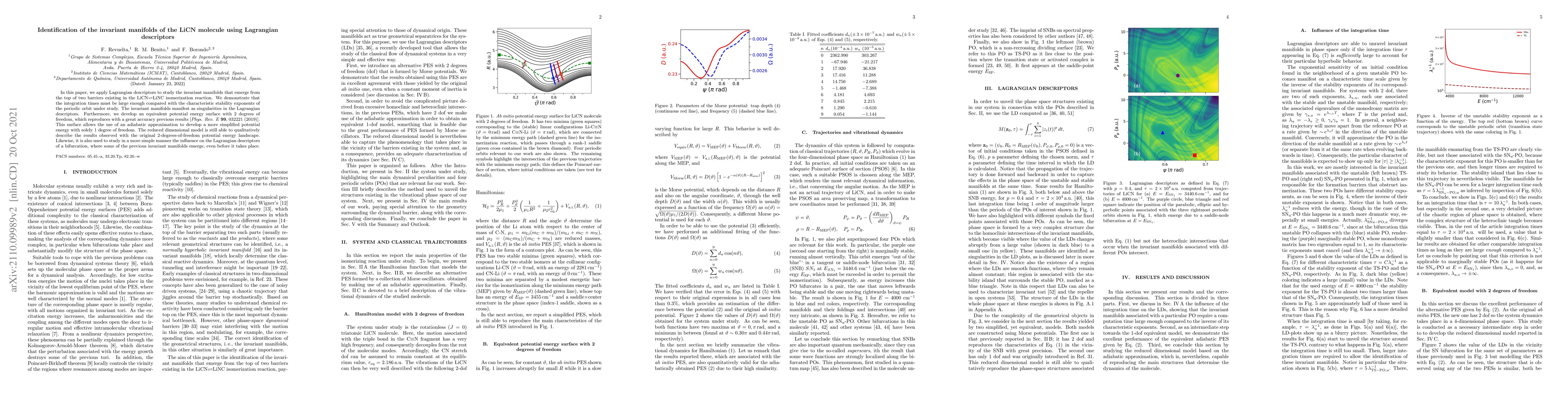 The paper introduces a method using Lagrangian descriptors to identify and analyze invariant manifolds in molecular dynamics, providing a simplified 1D model for complex 2D systems.