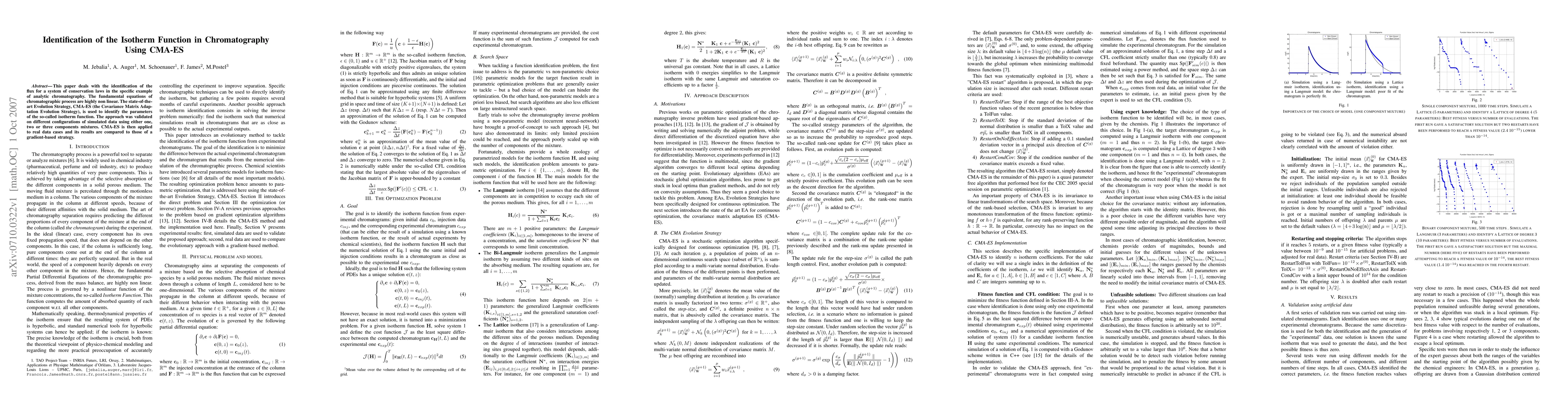This paper uses the CMA-ES evolution strategy to identify parameters for the isotherm function in chromatography, validated through simulated and real data comparisons with gradient-based methods. The approach demonstrates effectiveness in handling the highly nonlinear fundamental equations of the chromatographic process.