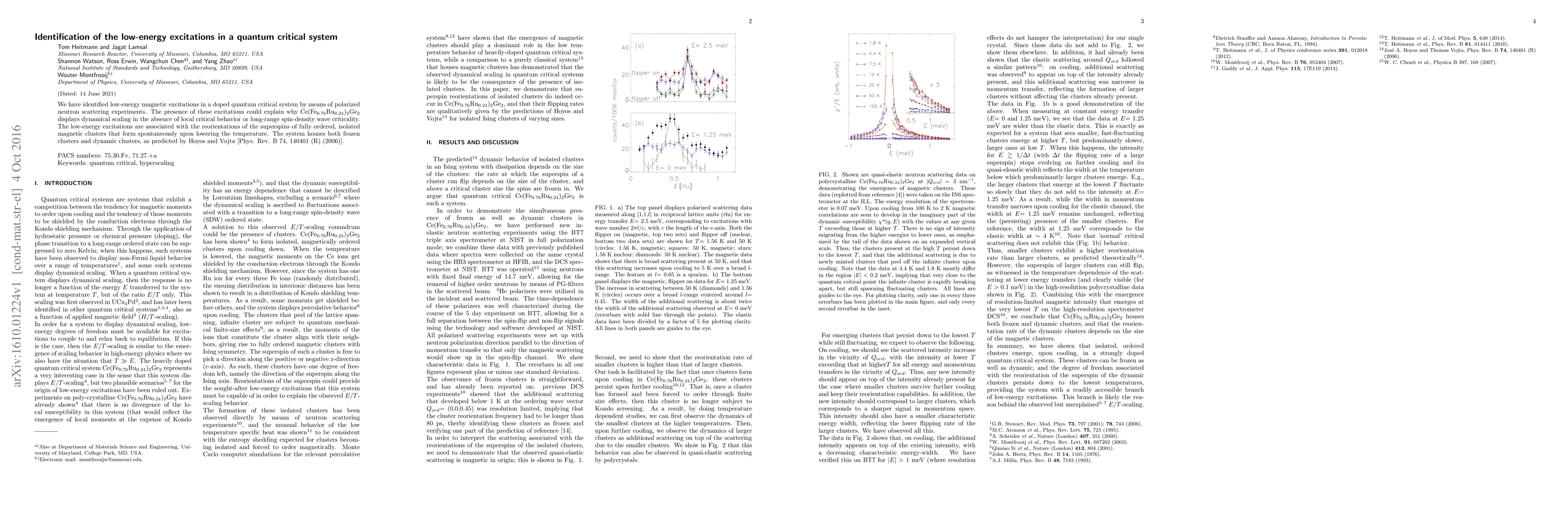 We have identified low-energy magnetic excitations in a doped quantum critical system by means of polarized neutron scattering experiments. The presence of these excitations could explain why Ce(Fe$_{0.76}$Ru$_{0.24}$)$_2$Ge$_2$ displays dynamical scaling in the absence of local critical behavior or long-range spin-density wave criticality. The low-energy excitations are associated with the reorientations of the superspins of fully ordered, isolated magnetic clusters that form spontaneously upon lowering the temperature. The system houses both frozen clusters and dynamic clusters, as predicted by Hoyos and Vojta [Phys. Rev. B 74, 140401 (R) (2006)].
