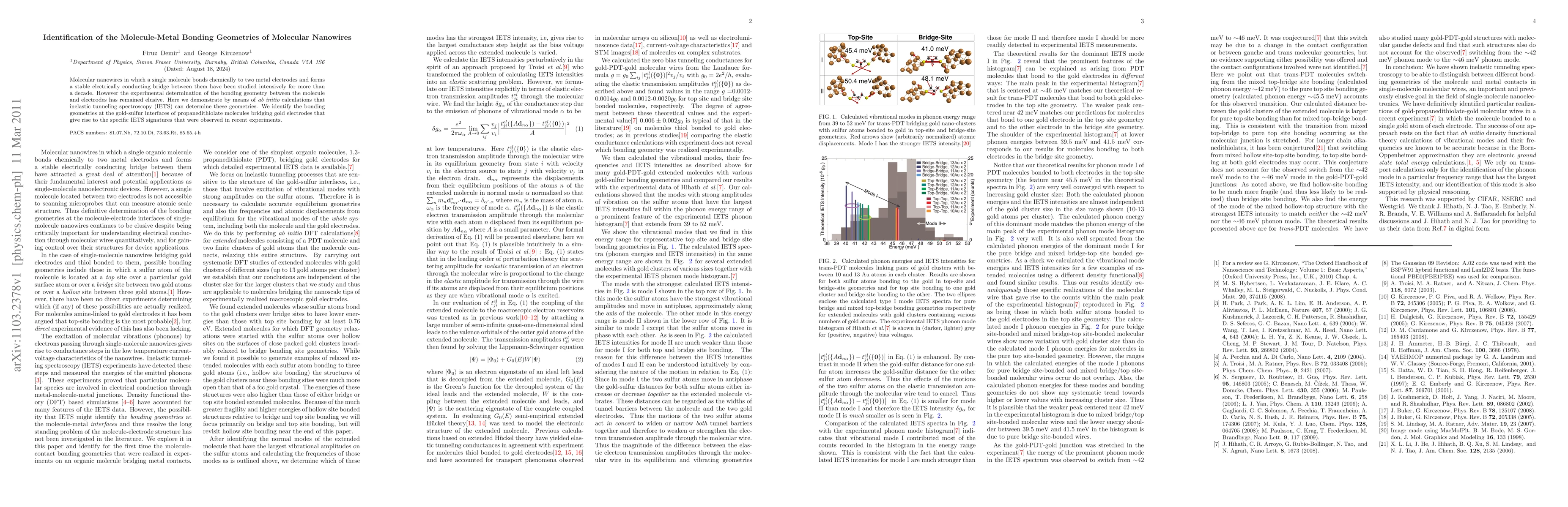 This research demonstrates that ab initio calculations combined with inelastic tunneling spectroscopy (IETS) can determine the molecule-metal bonding geometries in molecular nanowires, specifically identifying the gold-sulfur interface geometries in propanedithiolate molecules. This method provides a means to elucidate the structure of these conductive molecular bridges.
