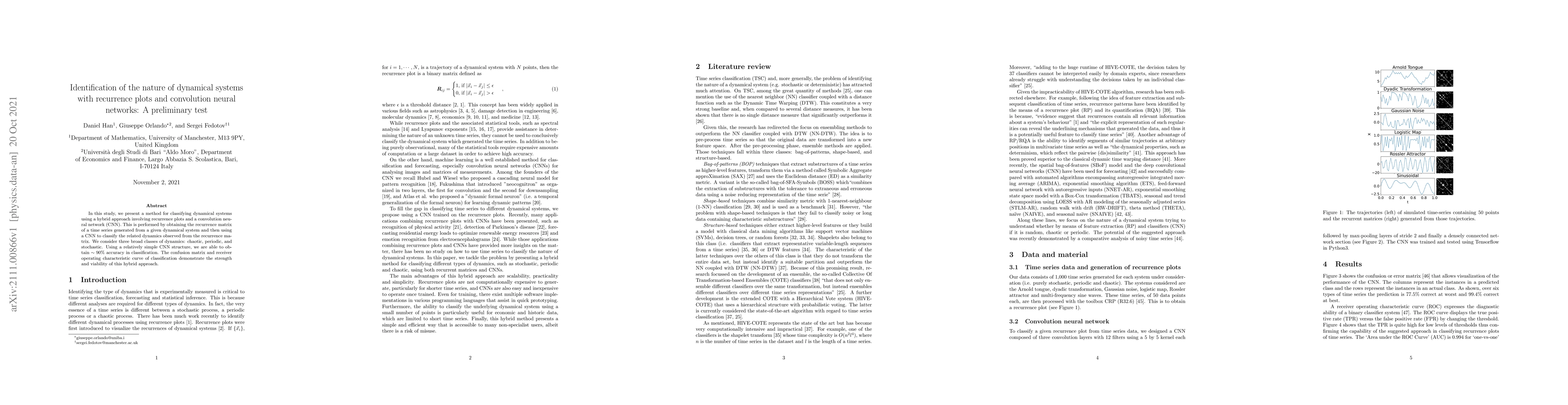 This research introduces a hybrid method for classifying dynamical systems, combining recurrence plots and convolutional neural networks (CNNs). By analyzing recurrence matrices from time series data, the CNN successfully identifies system dynamics as chaotic, periodic, or stochastic, achieving approximately 90% classification accuracy.