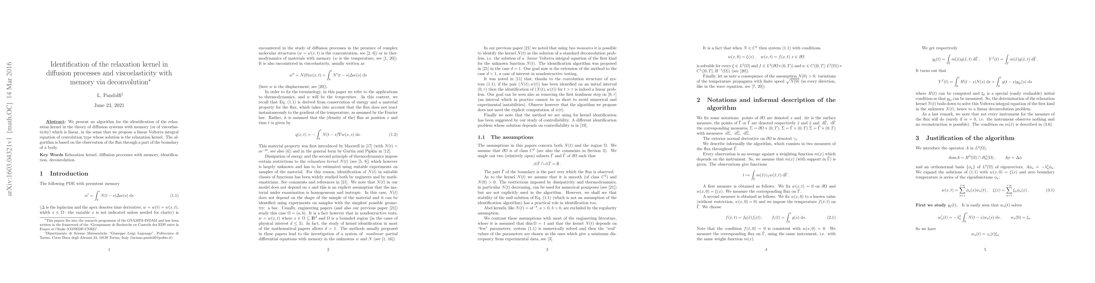 This paper presents an algorithm to identify the relaxation kernel in diffusion systems with memory, which is crucial for understanding viscoelasticity. It uses a linear Volterra integral equation of convolution type and observes flux through a body's boundary to make its key finding.