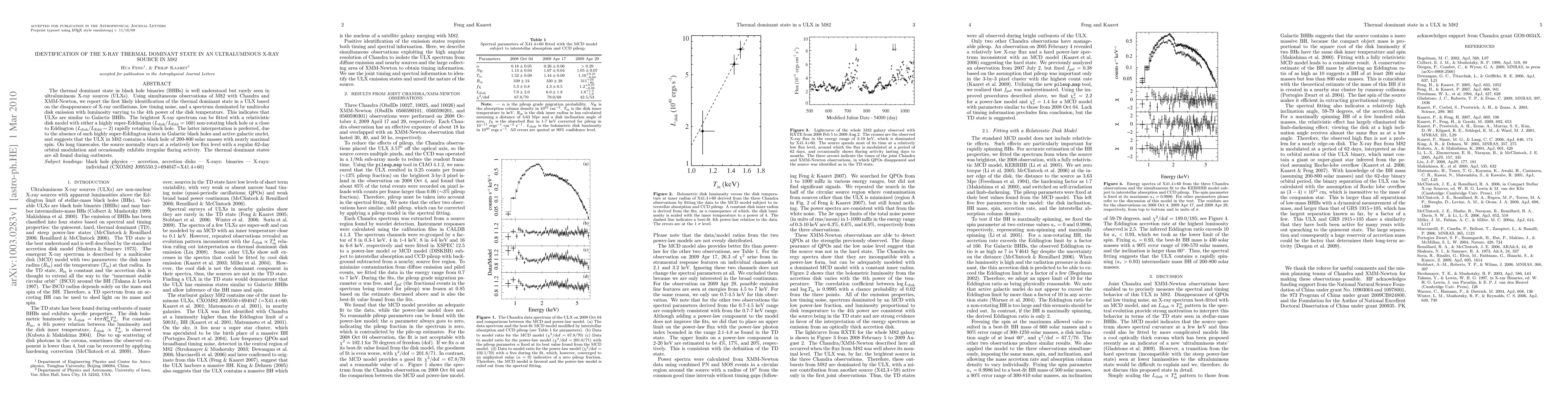 This paper identifies the thermal dominant state in an ultraluminous X-ray source (ULX) in M82 for the first time, indicating ULXs share characteristics with black hole binaries. The preferred model suggests the ULX contains a black hole of 200-800 solar masses with nearly maximal spin.
