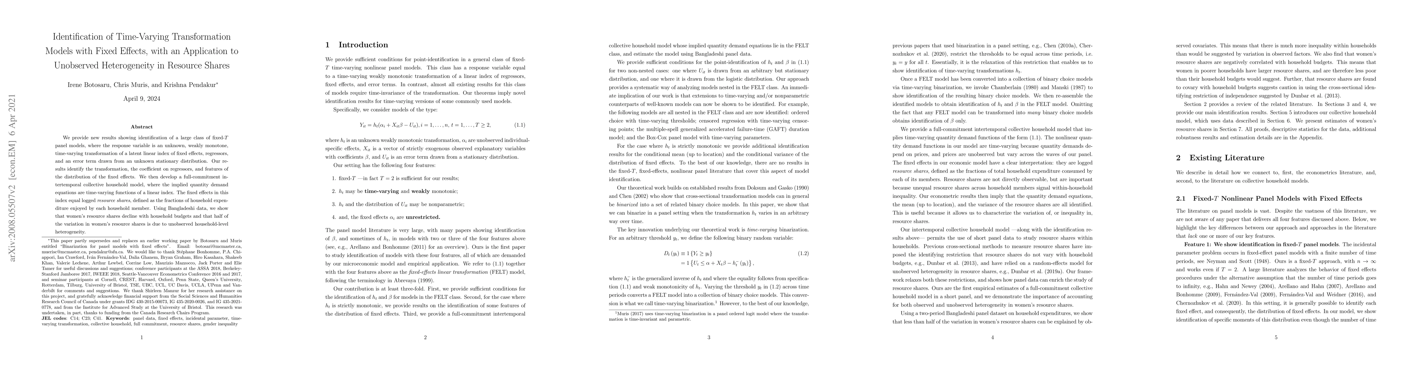 We provide new results showing identification of a large class of fixed-T panel models, where the response variable is an unknown, weakly monotone, time-varying transformation of a latent linear index of fixed effects, regressors, and an error term drawn from an unknown stationary distribution. Our results identify the transformation, the coefficient on regressors, and features of the distribution of the fixed effects. We then develop a full-commitment intertemporal collective household model, where the implied quantity demand equations are time-varying functions of a linear index. The fixed effects in this index equal logged resource shares, defined as the fractions of household expenditure enjoyed by each household member. Using Bangladeshi data, we show that women's resource shares decline with household budgets and that half of the variation in women's resource shares is due to unobserved household-level heterogeneity.