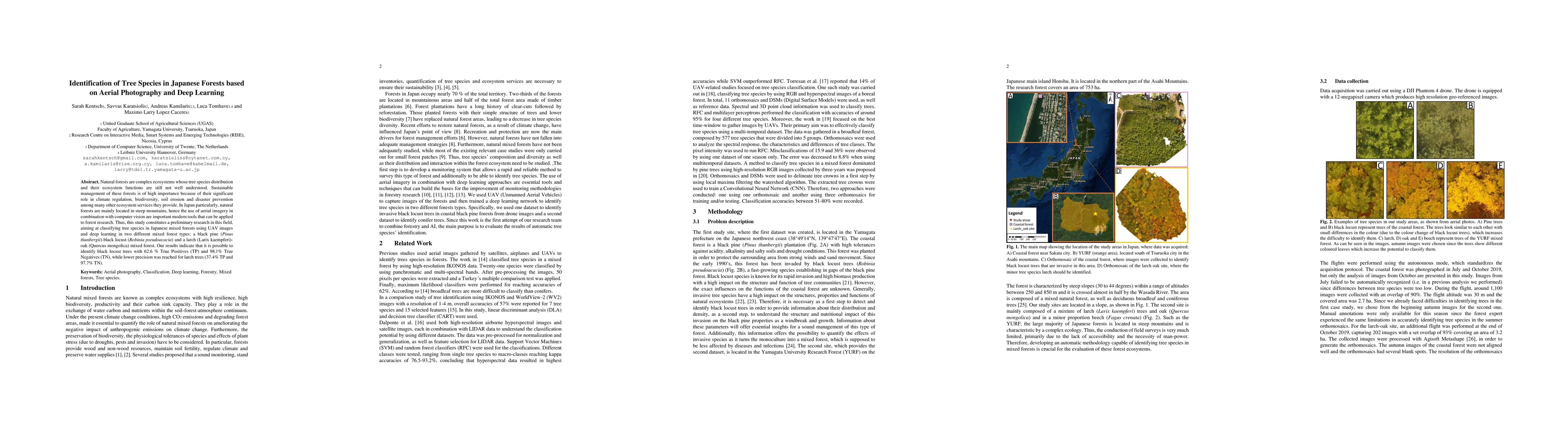 This study employs aerial photography and deep learning to classify tree species in Japanese mixed forests, achieving 62.6% true positives for black locust and 37.4% for larch, highlighting the potential of UAV imagery in forest research. The research underscores the importance of sustainable forest management through improved understanding of tree species distribution.