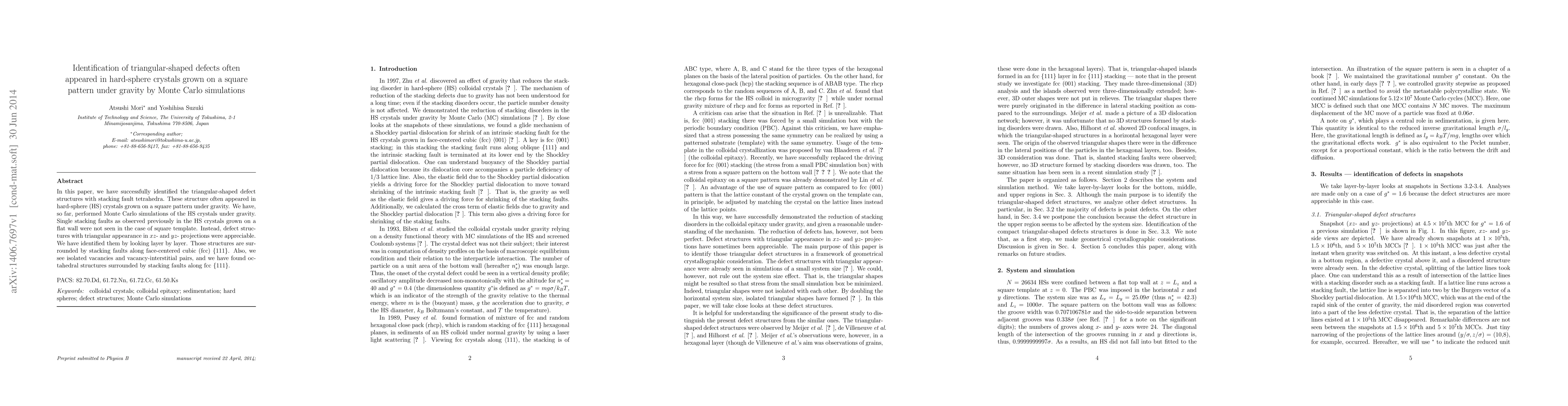 In this paper, we have successfully identified the triangular-shaped defect structures with stacking fault tetrahedra. These structure often appeared in hard-sphere (HS) crystals grown on a square pattern under gravity. We have, so far, performed Monte Carlo simulations of the HS crystals under gravity. Single stacking faults as observed previously in the HS crystals grown on a flat wall were not seen in the case of square template. Instead, defect structures with triangular appearance in $xz$- and $yz$- projections were appreciable. We have identified them by looking layer by layer. Those structures are surrounded by stacking faults along face-centered cubic (fcc) {111}. Also, we see isolated vacancies and vacancy-interstitial pairs, and we have found octahedral structures surrounded by stacking faults along fcc {111}.