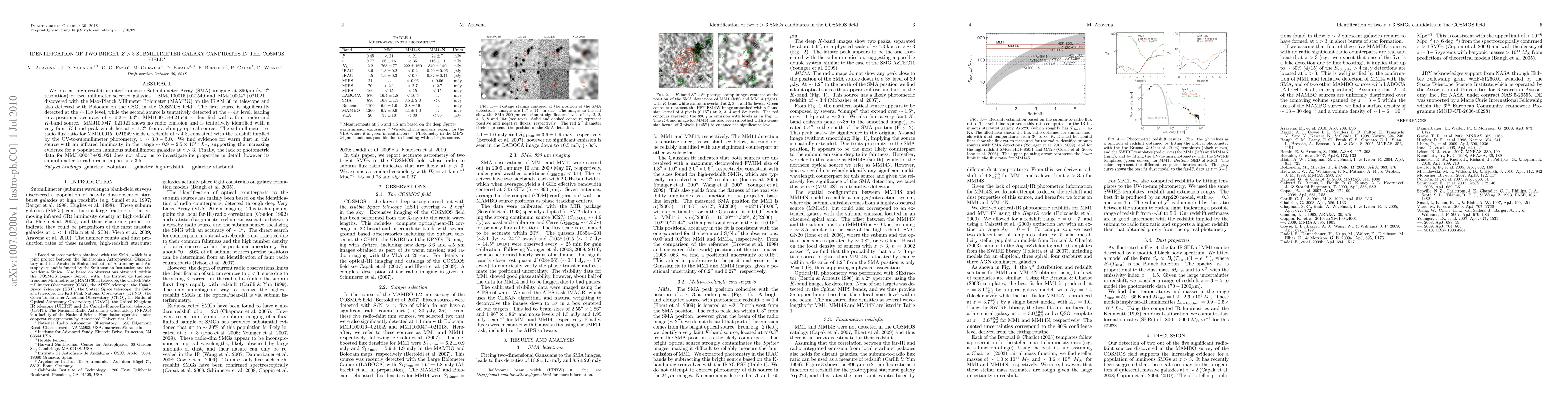 We present high-resolution interferometric Submillimeter Array (SMA) imaging at 890 microns (~2" resolution) of two millimeter selected galaxies -- MMJ100015+021549 and MMJ100047+021021 -- discovered with the Max-Planck Millimeter Bolometer (MAMBO) on the IRAM 30 m telescope and also detected with Bolocam on the CSO, in the COSMOS field. The first source is significantly detected at the ~11 sigma level, while the second source is tentatively detected at the ~4 sigma level, leading to a positional accuracy of ~0.2-0.3". MM100015+021549 is identified with a faint radio and K-band source. MMJ100047+021021 shows no radio emission and is tentatively identified with a very faint K-band peak which lies at ~1.2" from a clumpy optical source. The submillimeter-to-radio flux ratio for MM100015+021549 yields a redshift of ~4.8, consistent with the redshift implied by the UV-to-submillimeter photometry, z~3.0-5.0. We find evidence for warm dust in this source with an infrared luminosity in the range ~0.9-2.5x10^{13} L_sun, supporting the increasing evidence for a population luminous submillimeter galaxies at z>3. Finally, the lack of photometric data for MMJ100047+021021 does not allow us to investigate its properties in detail, however its submillimeter-to-radio ratio implies z>3.5.