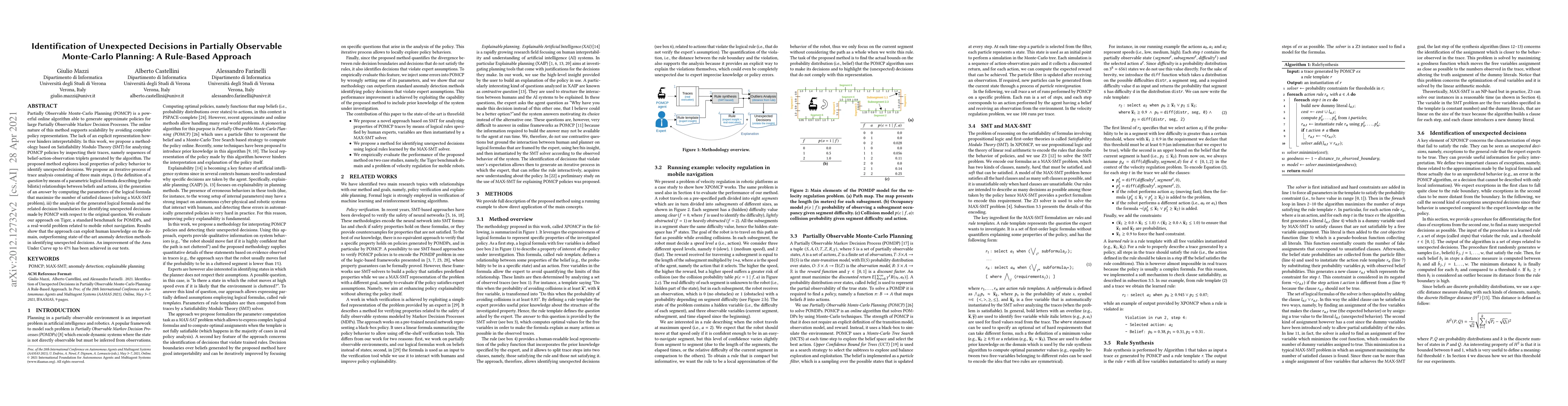 This paper proposes a rule-based approach using Satisfiability Modulo Theory (SMT) to analyze Partially Observable Monte-Carlo Planning (POMCP) policies by inspecting their traces. The method identifies unexpected decisions through an iterative process involving logical formula definition, MAX-SMT problem solving, and decision boundary analysis, achieving up to 47% improvement in anomaly detection over state-of-the-art methods.