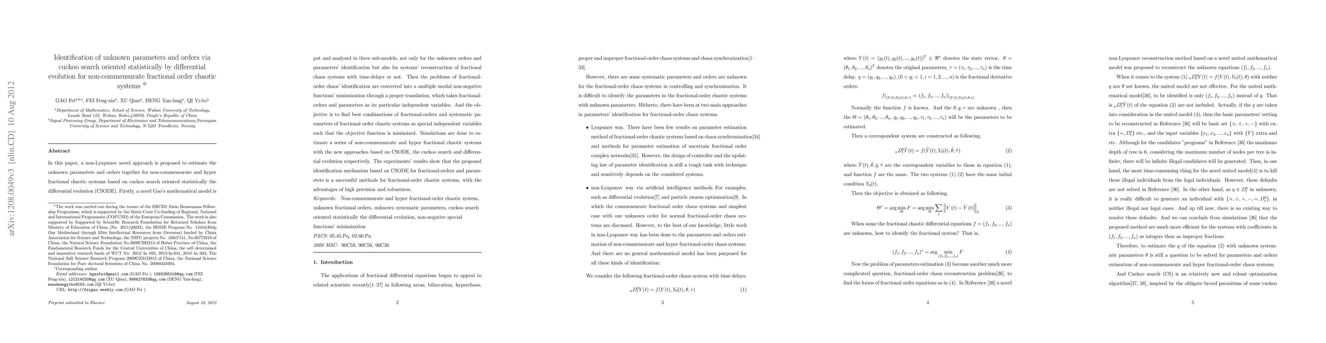 Identification of the unknown parameters and orders of fractional chaotic systems is of vital significance in controlling and synchronization of fractional-order chaotic systems. In this paper, a non-Lyapunov novel approach is proposed to estimate the unknown parameters and orders together for non-commensurate and hyper fractional chaotic systems based on cuckoo search oriented statistically the differential evolution (CSODE). Firstly, a novel Gao's mathematical model is put and analysed in three sub-models, not only for the unknown orders and parameters' identification but also for systems' reconstruction of fractional chaos systems with time-delays or not. Then the problems of fractional-order chaos' identification are converted into a multiple modal non-negative functions' minimization through a proper translation, which takes fractional-orders and parameters as its particular independent variables. And the objective is to find best combinations of fractional-orders and systematic parameters of fractional order chaotic systems as special independent variables such that the objective function is minimized. Simulations are done to estimate a series of non-commensurate and hyper fractional chaotic systems with the new approaches based on CSODE, the cuckoo search and differential evolution respectively. The experiments' results show that the proposed identification mechanism based on CSODE for fractional-orders and parameters is a successful methods for fractional-order chaotic systems, with the advantages of high precision and robustness.