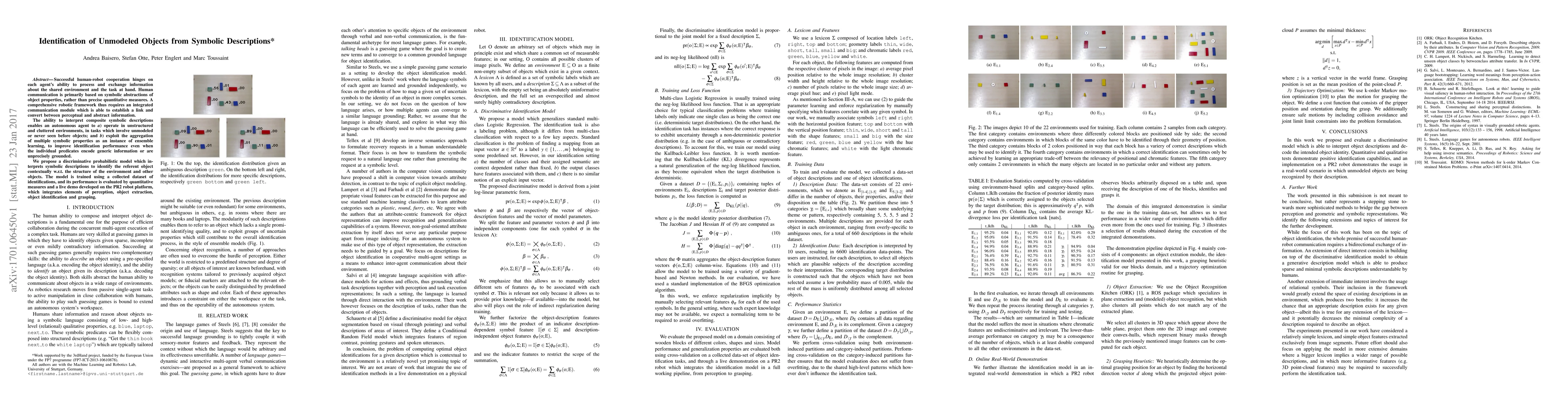 A robotic framework enables autonomous agents to identify unmodeled objects from symbolic descriptions, improving performance in cluttered environments. The approach uses a discriminative probabilistic model trained with a dataset of identifications, achieving promising results on the PR2 robot platform.