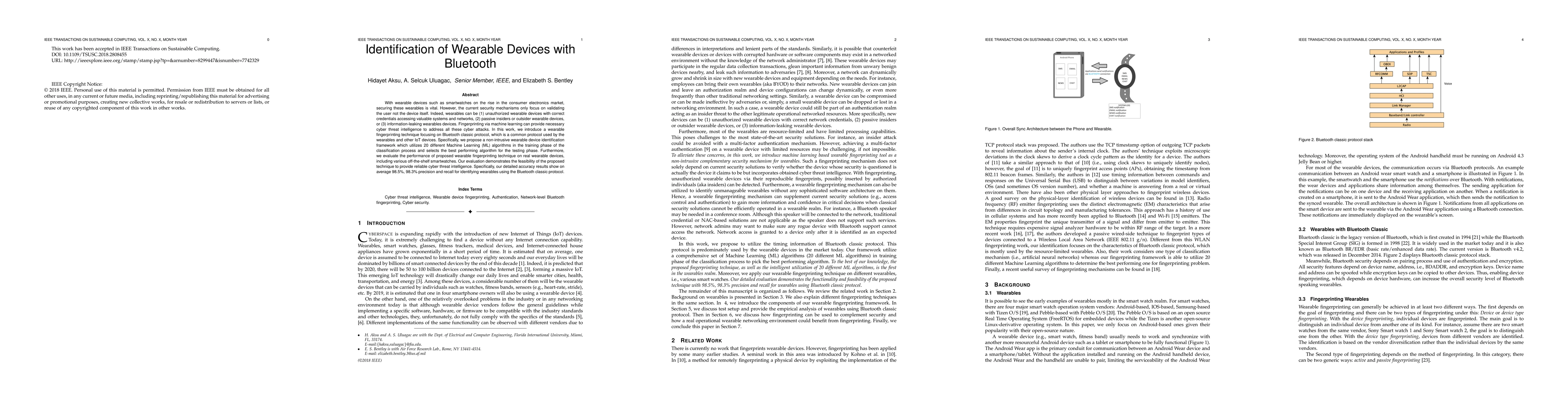 This paper proposes a non-intrusive wearable device identification framework using Bluetooth classic protocol and machine learning to address security vulnerabilities. The technique achieves high accuracy, with an average of 98.5% precision and recall, demonstrating its effectiveness in providing reliable cyber threat intelligence.