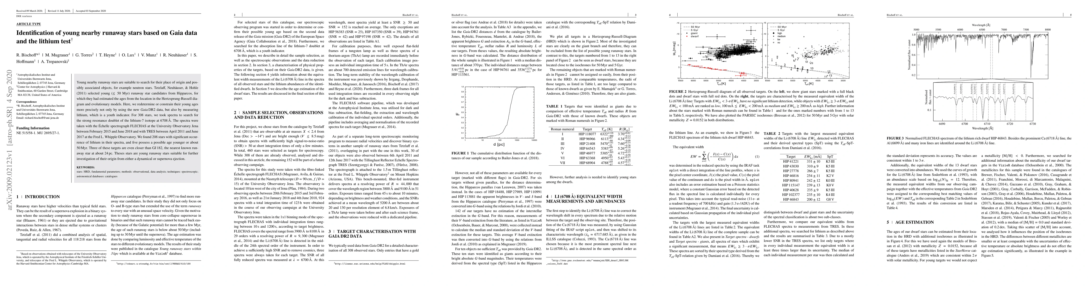 Young nearby runaway stars are suitable to search for their place of origin and possibly associated objects, for example neutron stars. Tetzlaff, Neuh\"auser & Hohle (2011) selected young ($\le 50$ Myr) runaway star candidates from Hipparcos, for which they had estimated the ages from the location in the Hertzsprung-Russell diagram and evolutionary models. Here, we redetermine or constrain their young ages more precisely not only by using the new Gaia DR2 data, but also by measuring lithium, which is a youth indicator. For 308 stars, we took spectra to search for the strong resonance doublet of the lithium-7 isotope at 6708 $\unicode{xC5}$. The spectra were taken with the \'Echelle spectrograph FLECHAS at the University Observatory Jena between February 2015 and June 2018 and with TRES between April 2011 and June 2017 at the Fred L. Whipple Observatory. We found 208 stars with significant occurrence of lithium in their spectra, and five possess a possible age younger or about 50 Myr. Three of these targets are even closer than GJ 182, the nearest known runaway star at about 24 pc. Theses stars are young runaway stars suitable for further investigation of their origin from either a dynamical or supernova ejection.