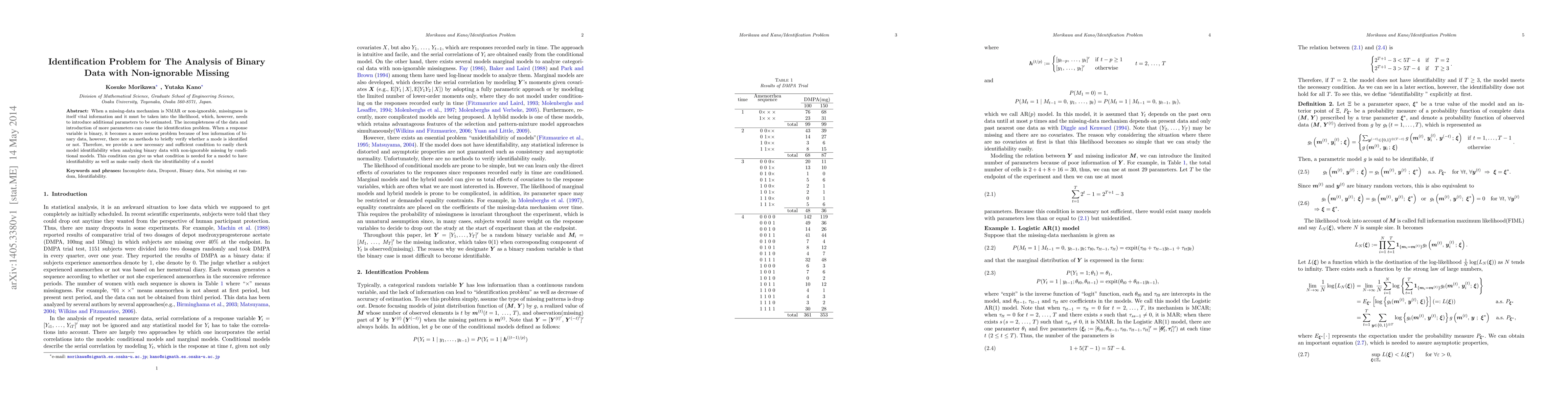 This paper addresses the identification problem in analyzing binary data with non-ignorable missingness, proposing a new necessary and sufficient condition for model identifiability. It aims to simplify the verification of whether a model is identifiable, especially when dealing with binary data where missingness carries significant information.