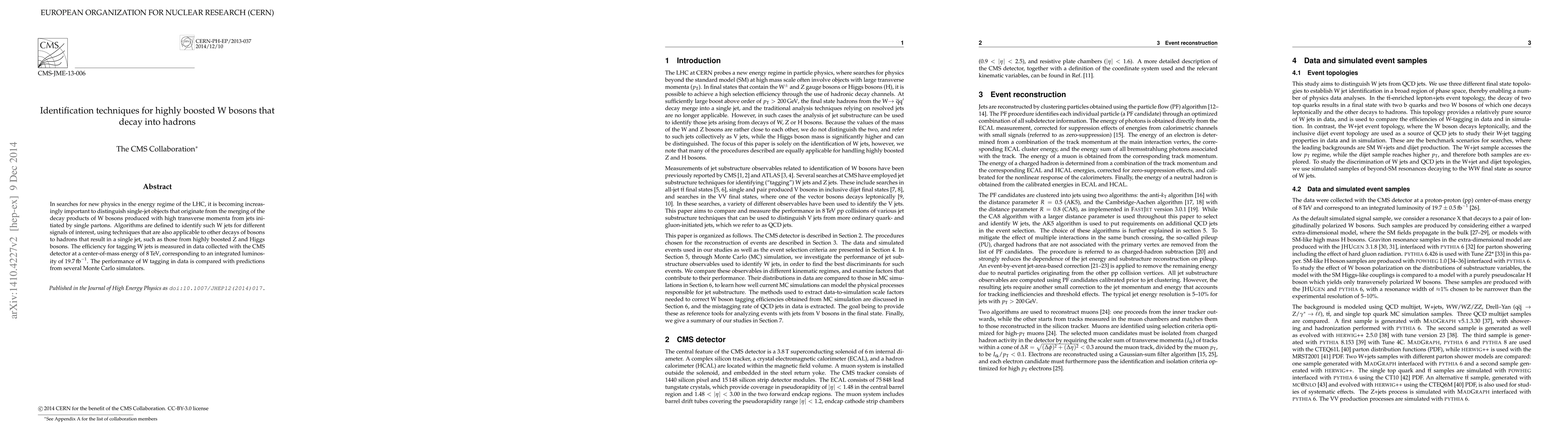 This research introduces algorithms to identify W jets from highly boosted W bosons decaying into hadrons, crucial for distinguishing them from single parton jets in LHC collisions. Performance of these W tagging methods is evaluated using CMS detector data at 8 TeV, with comparisons to Monte Carlo simulator predictions.