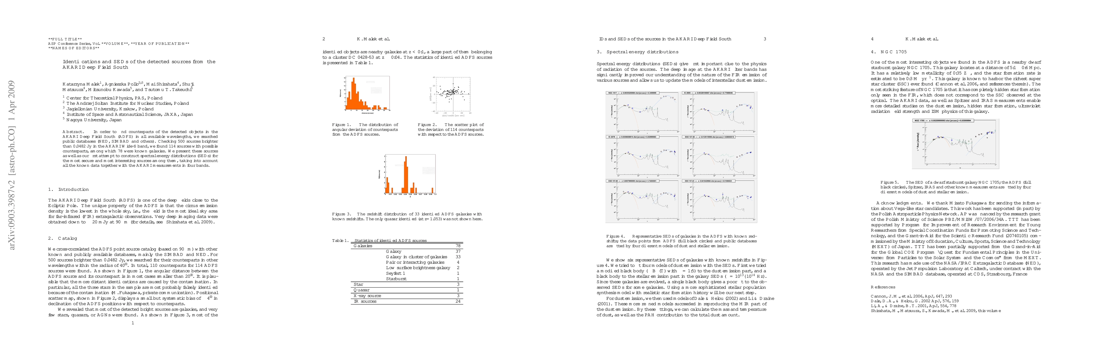 This paper identifies counterparts for 114 sources detected in the AKARI Deep Field South, with 78 being known galaxies, and constructs spectral energy distributions (SEDs) for the most secure and interesting sources using data from multiple wavelengths.