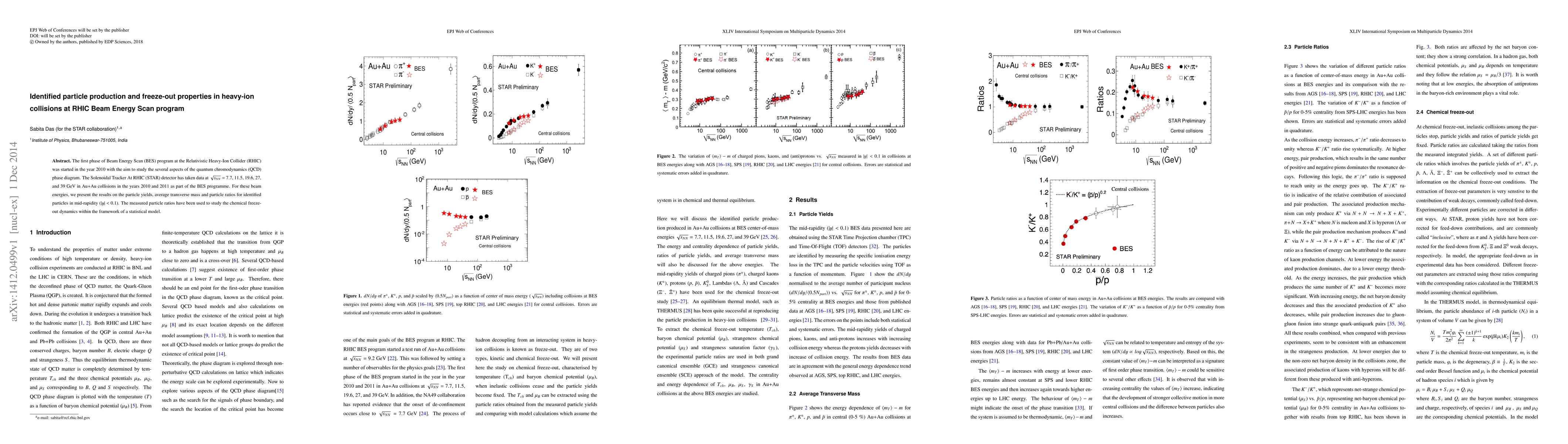 This paper reports on identified particle production and freeze-out properties from heavy-ion collisions at various beam energies in the RHIC Beam Energy Scan program. The STAR detector's data at different energies were analyzed to study particle yields and ratios, which were used to investigate chemical freeze-out dynamics using a statistical model.