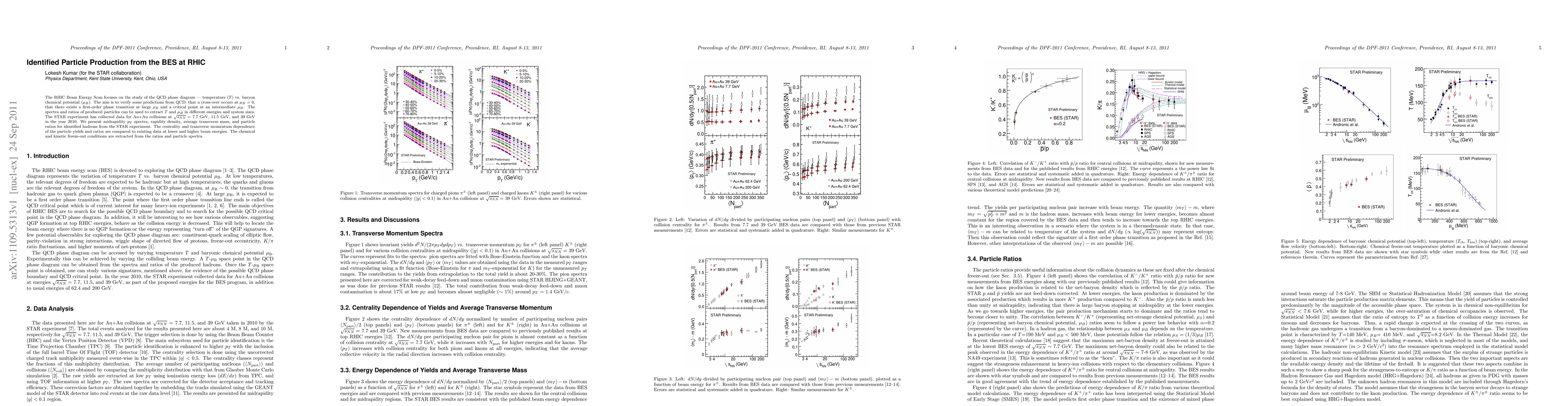 The RHIC Beam Energy Scan focuses on the study of the QCD phase diagram --- temperature ($T$) vs. baryon chemical potential ($\mu_B$). The aim is to verify some predictions from QCD: that a cross-over occurs at $\mu_B$ = 0, that there exists a first-order phase transition at large $\mu_B$ and a critical point at an intermediate $\mu_B$. The spectra and ratios of produced particles can be used to extract $T$ and $\mu_B$ in different energies and system sizes. The STAR experiment has collected data for Au+Au collisions at $\sqrt{s_{NN}}=$ 7.7 GeV, 11.5 GeV, and 39 GeV in the year 2010. We present midrapidity $p_{T}$ spectra, rapidity density, average transverse mass, and particle ratios for identified hadrons from the STAR experiment. The centrality and transverse momentum dependence of the particle yields and ratios are compared to existing data at lower and higher beam energies. The chemical and kinetic freeze-out conditions are extracted from the ratios and particle spectra.