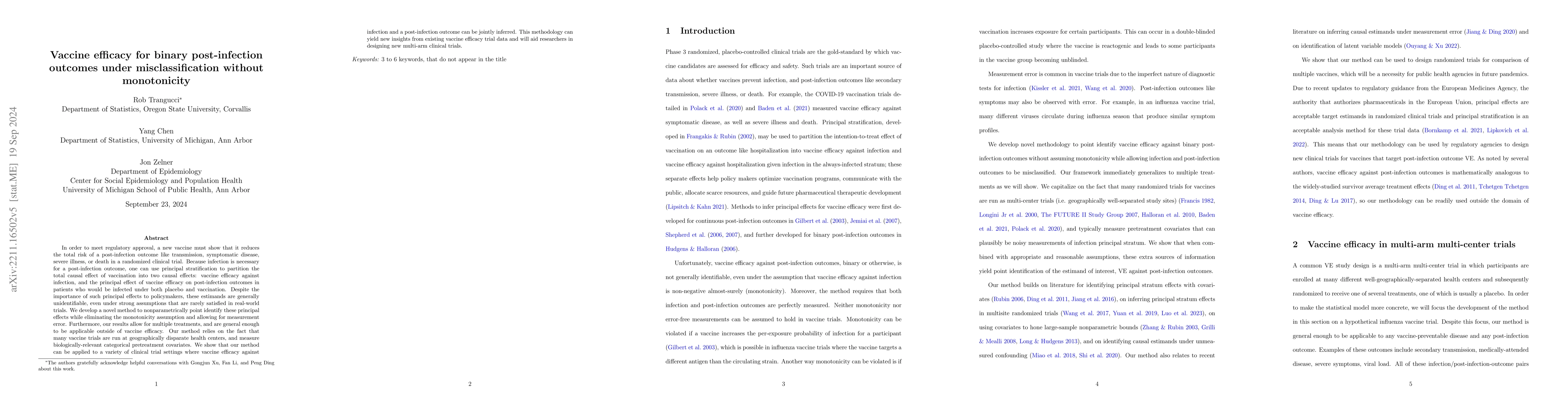 In order to meet regulatory approval, pharmaceutical companies often must demonstrate that new vaccines reduce the total risk of a post-infection outcome like transmission, symptomatic disease, severe illness, or death in randomized, placebo-controlled trials. Given that infection is a necessary precondition for a post-infection outcome, one can use principal stratification to partition the total causal effect of vaccination into two causal effects: vaccine efficacy against infection, and the principal effect of vaccine efficacy against a post-infection outcome in the patients that would be infected under both placebo and vaccination. Despite the importance of such principal effects to policymakers, these estimands are generally unidentifiable, even under strong assumptions that are rarely satisfied in real-world trials. We develop a novel method to nonparametrically point identify these principal effects while eliminating the monotonicity assumption and allowing for measurement error. Furthermore, our results allow for multiple treatments, and are general enough to be applicable outside of vaccine efficacy. Our method relies on the fact that many vaccine trials are run at geographically disparate health centers, and measure biologically-relevant categorical pretreatment covariates. We show that our method can be applied to a variety of clinical trial settings where vaccine efficacy against infection and a post-infection outcome can be jointly inferred. This can yield new insights from existing vaccine efficacy trial data and will aid researchers in designing new multi-arm clinical trials.