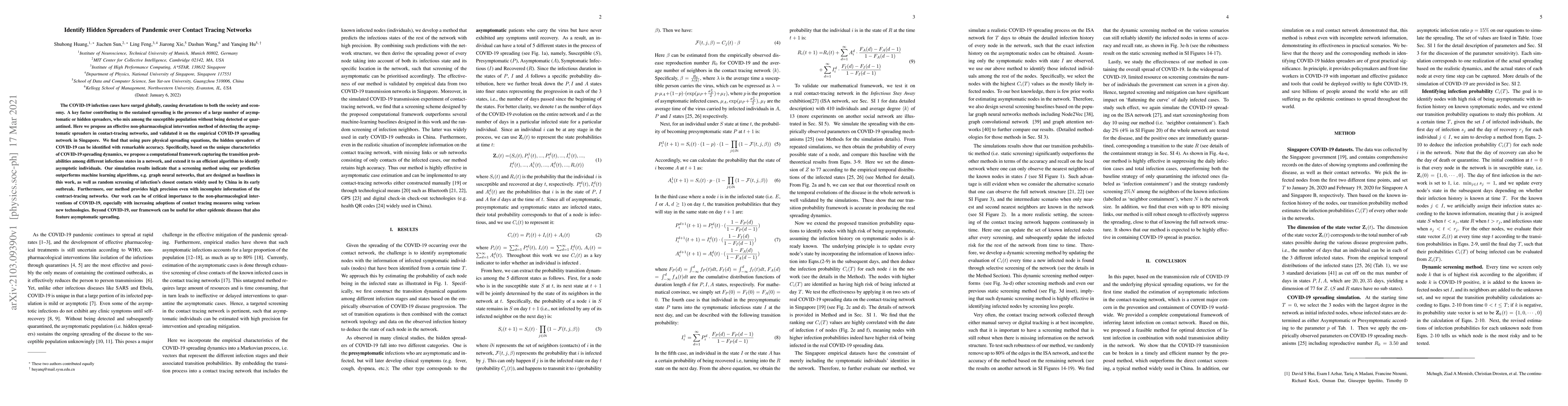 The COVID-19 infection cases have surged globally, causing devastations to both the society and economy. A key factor contributing to the sustained spreading is the presence of a large number of asymptomatic or hidden spreaders, who mix among the susceptible population without being detected or quarantined. Here we propose an effective non-pharmacological intervention method of detecting the asymptomatic spreaders in contact-tracing networks, and validated it on the empirical COVID-19 spreading network in Singapore. We find that using pure physical spreading equations, the hidden spreaders of COVID-19 can be identified with remarkable accuracy. Specifically, based on the unique characteristics of COVID-19 spreading dynamics, we propose a computational framework capturing the transition probabilities among different infectious states in a network, and extend it to an efficient algorithm to identify asymptotic individuals. Our simulation results indicate that a screening method using our prediction outperforms machine learning algorithms, e.g. graph neural networks, that are designed as baselines in this work, as well as random screening of infection's closest contacts widely used by China in its early outbreak. Furthermore, our method provides high precision even with incomplete information of the contract-tracing networks. Our work can be of critical importance to the non-pharmacological interventions of COVID-19, especially with increasing adoptions of contact tracing measures using various new technologies. Beyond COVID-19, our framework can be useful for other epidemic diseases that also feature asymptomatic spreading