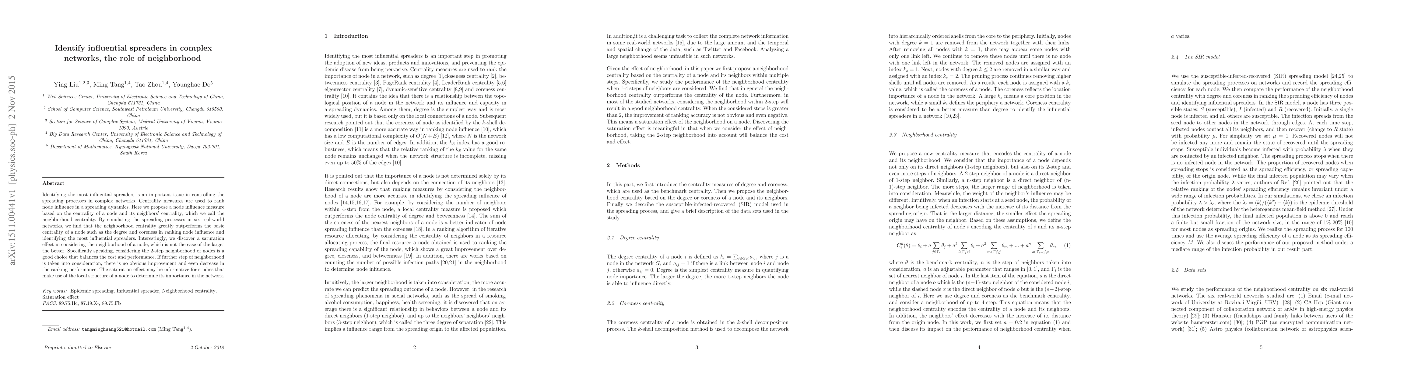 This paper proposes a novel node influence measure called neighborhood centrality, which considers both a node's centrality and the centrality of its neighbors. Simulation results on six real-world networks show that neighborhood centrality outperforms traditional centrality measures in identifying influential spreaders, with a 2-step neighborhood providing optimal balance between cost and performance.
