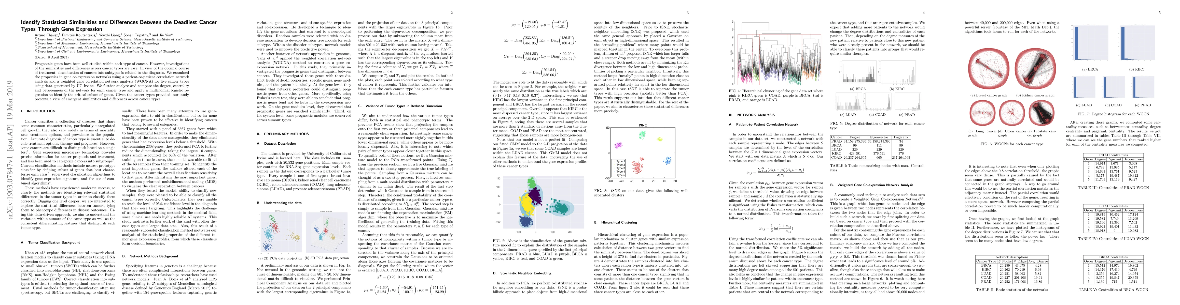 Prognostic genes have been well studied within each type of cancer. However, investigations of the similarities and differences across cancer types are rare. In view of the optimal course of treatment, the classification of cancers into subtypes is critical to the diagnosis. We examined the properties in gene co-expression networks using a patient-to-patient correlation network analysis and a weighted gene correlation network analysis (WGCNA) for five cancer types using data generated by UC Irvine. We further analyze and compare the degree, centrality and betweenness of the network for each cancer type and apply a multinomial logistic regression to identify the critical subset of genes. Given the cancer types provided, our study presents a view of emergent similarities and differences across cancer types.