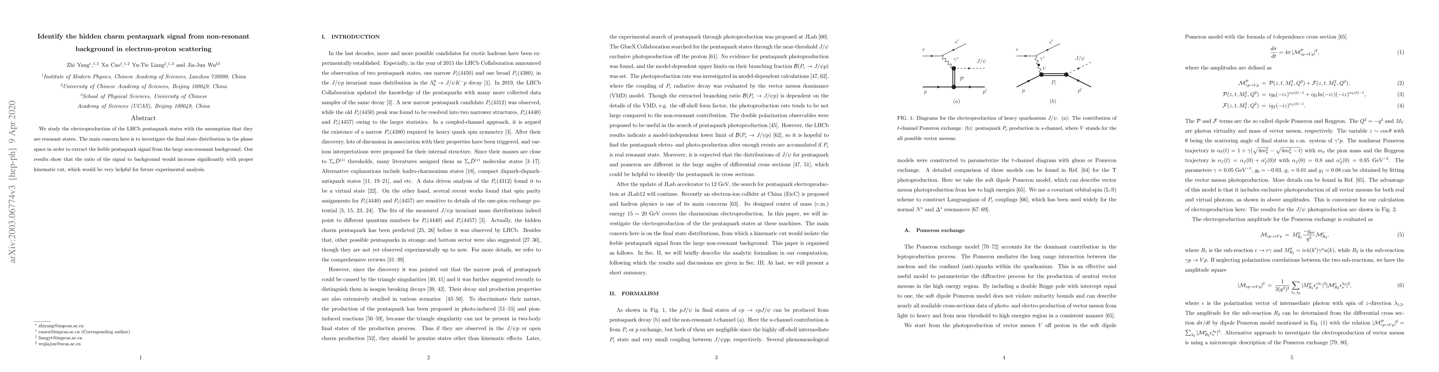 We study the electroproduction of the LHCb pentaquark states with the assumption that they are resonant states. The main concern here is to investigate the final state distribution in the phase space in order to extract the feeble pentaquark signal from the large non-resonant background. Our results show that the ratio of the signal to background would increase significantly with proper kinematic cut, which would be very helpful for future experimental analysis.