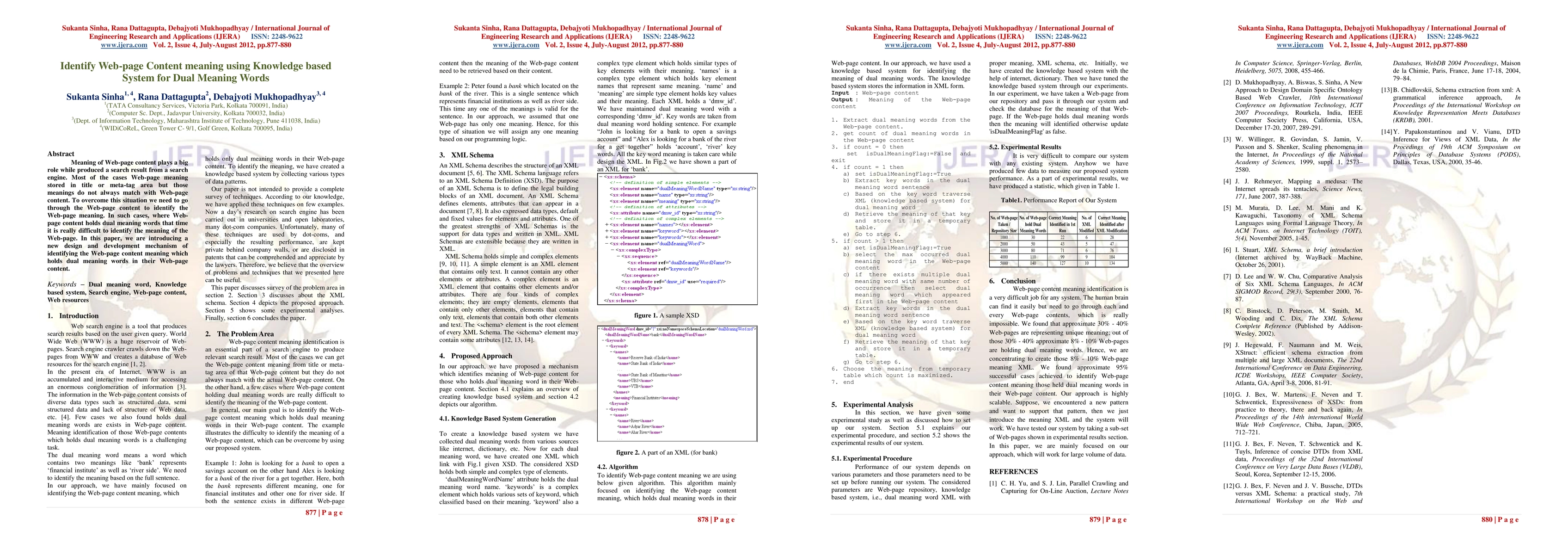 This paper proposes a knowledge-based system to identify the meaning of web-page content, especially for dual meaning words, to improve search result accuracy. The system aims to overcome discrepancies between title/meta-tag meanings and actual web-page content.