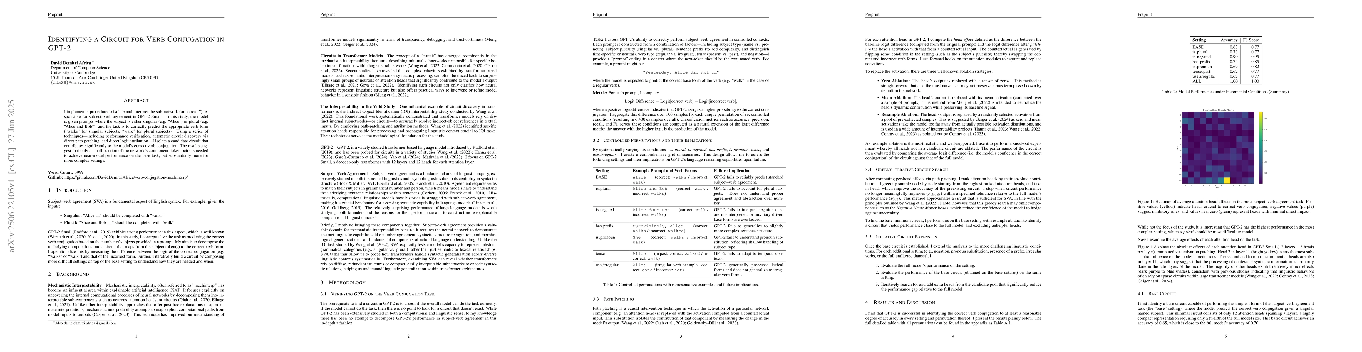 I implement a procedure to isolate and interpret the sub-network (or "circuit") responsible for subject-verb agreement in GPT-2 Small. In this study, the model is given prompts where the subject is either singular (e.g. "Alice") or plural (e.g. "Alice and Bob"), and the task is to correctly predict the appropriate verb form ("walks" for singular subjects, "walk" for plural subjects). Using a series of techniques-including performance verification automatic circuit discovery via direct path patching, and direct logit attribution- I isolate a candidate circuit that contributes significantly to the model's correct verb conjugation. The results suggest that only a small fraction of the network's component-token pairs is needed to achieve near-model performance on the base task but substantially more for more complex settings.