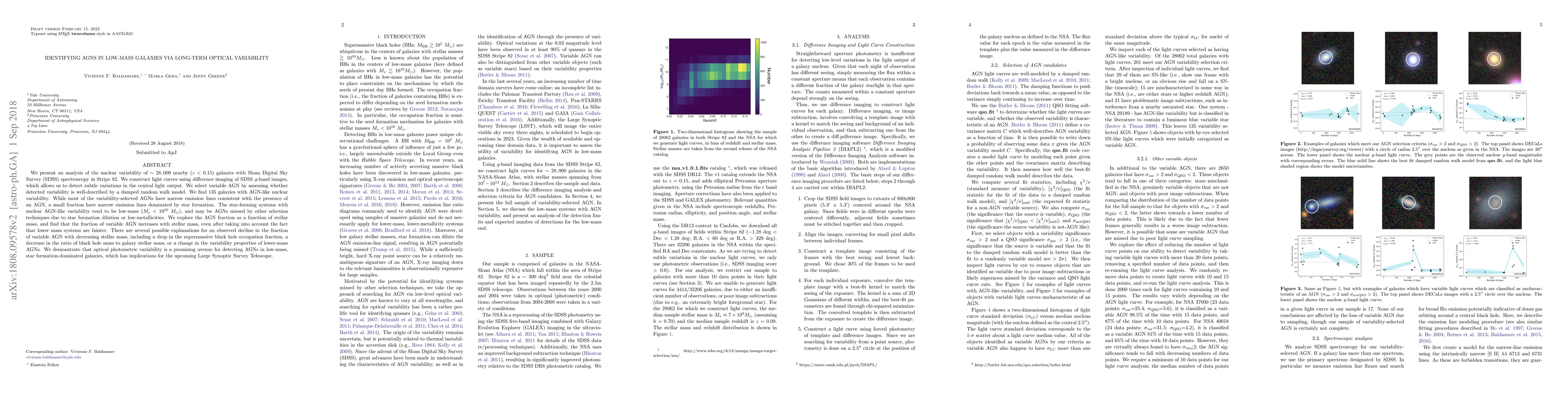 We present an analysis of the nuclear variability of $\sim28,000$ nearby ($z<0.15$) galaxies with Sloan Digital Sky Survey (SDSS) spectroscopy in Stripe 82. We construct light curves using difference imaging of SDSS g-band images, which allows us to detect subtle variations in the central light output. We select variable AGN by assessing whether detected variability is well-described by a damped random walk model. We find 135 galaxies with AGN-like nuclear variability. While most of the variability-selected AGNs have narrow emission lines consistent with the presence of an AGN, a small fraction have narrow emission lines dominated by star formation. The star-forming systems with nuclear AGN-like variability tend to be low-mass ($M_{\ast}<10^{10}~M_{\odot}$), and may be AGNs missed by other selection techniques due to star formation dilution or low-metallicities. We explore the AGN fraction as a function of stellar mass, and find that the fraction of variable AGN increases with stellar mass, even after taking into account the fact that lower mass systems are fainter. There are several possible explanations for an observed decline in the fraction of variable AGN with decreasing stellar mass, including a drop in the supermassive black hole occupation fraction, a decrease in the ratio of black hole mass to galaxy stellar mass, or a change in the variability properties of lower-mass AGNs. We demonstrate that optical photometric variability is a promising avenue for detecting AGNs in low-mass, star formation-dominated galaxies, which has implications for the upcoming Large Synoptic Survey Telescope.