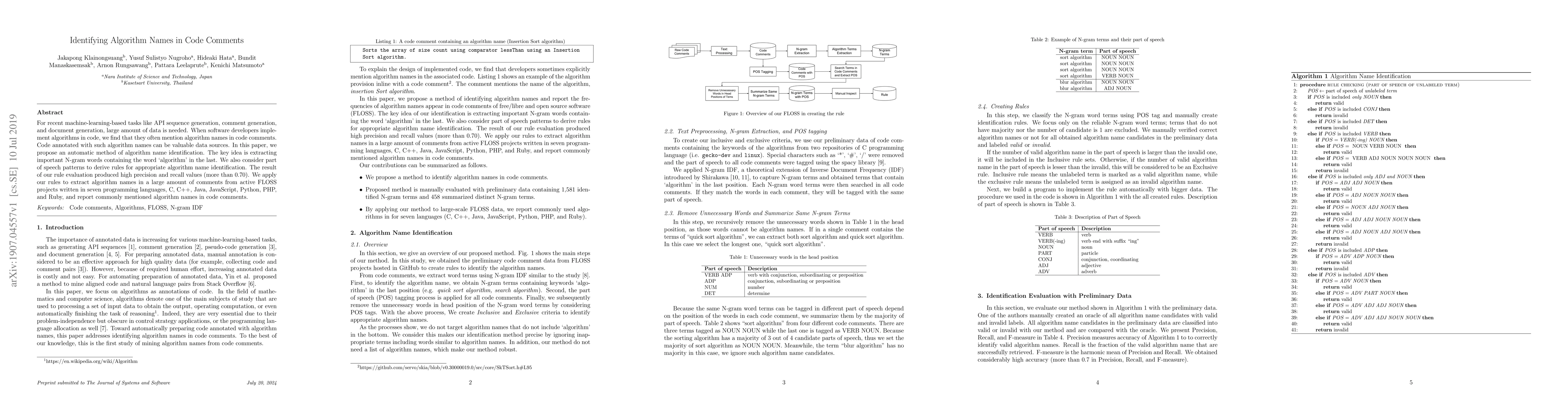 For recent machine-learning-based tasks like API sequence generation, comment generation, and document generation, large amount of data is needed. When software developers implement algorithms in code, we find that they often mention algorithm names in code comments. Code annotated with such algorithm names can be valuable data sources. In this paper, we propose an automatic method of algorithm name identification. The key idea is extracting important N-gram words containing the word `algorithm' in the last. We also consider part of speech patterns to derive rules for appropriate algorithm name identification. The result of our rule evaluation produced high precision and recall values (more than 0.70). We apply our rules to extract algorithm names in a large amount of comments from active FLOSS projects written in seven programming languages, C, C++, Java, JavaScript, Python, PHP, and Ruby, and report commonly mentioned algorithm names in code comments.
