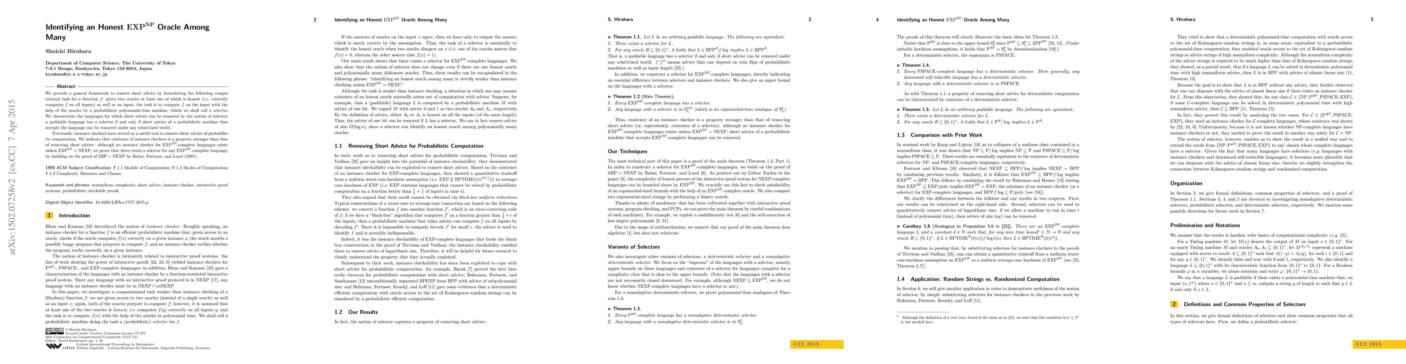 We provide a general framework to remove short advice by formulating the following computational task for a function $f$: given two oracles at least one of which is honest (i.e. correctly computes $f$ on all inputs) as well as an input, the task is to compute $f$ on the input with the help of the oracles by a probabilistic polynomial-time machine, which we shall call a selector. We characterize the languages for which short advice can be removed by the notion of selector: a paddable language has a selector if and only if short advice of a probabilistic machine that accepts the language can be removed under any relativized world. Previously, instance checkers have served as a useful tool to remove short advice of probabilistic computation. We indicate that existence of instance checkers is a property stronger than that of removing short advice: although no instance checker for ${\rm EXP}^{\rm NP}$-complete languages exists unless ${\rm EXP}^{\rm NP} = {\rm NEXP}$, we prove that there exists a selector for any ${\rm EXP}^{\rm NP}$-complete language, by building on the proof of ${\rm MIP} = {\rm NEXP}$ by Babai, Fortnow, and Lund (1991).