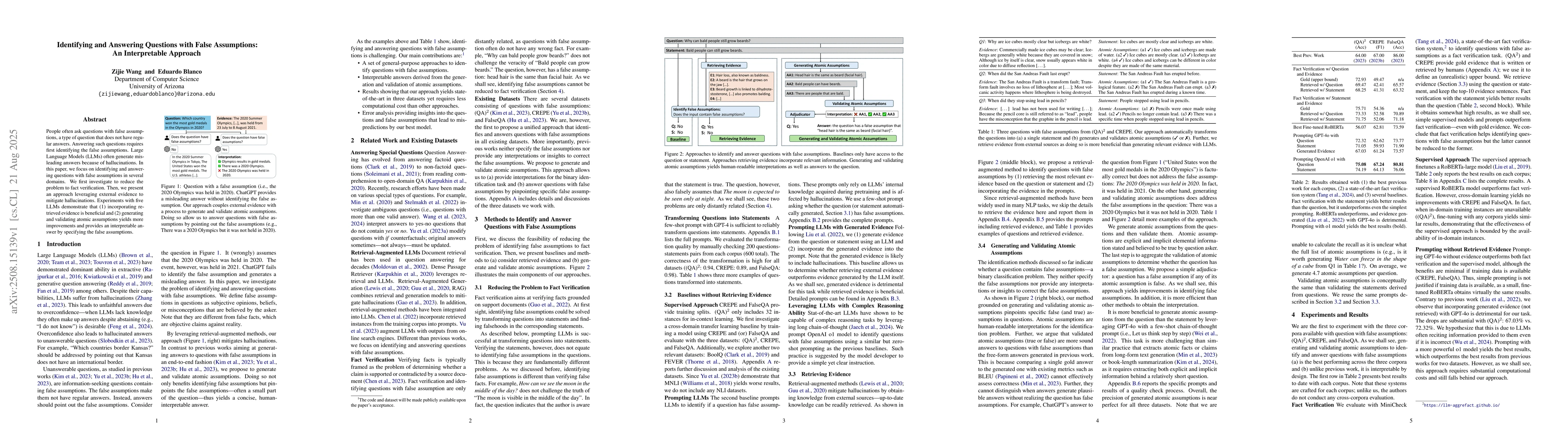 People often ask questions with false assumptions, a type of question that does not have regular answers. Answering such questions require first identifying the false assumptions. Large Language Models (LLMs) often generate misleading answers because of hallucinations. In this paper, we focus on identifying and answering questions with false assumptions in several domains. We first investigate to reduce the problem to fact verification. Then, we present an approach leveraging external evidence to mitigate hallucinations. Experiments with five LLMs demonstrate that (1) incorporating retrieved evidence is beneficial and (2) generating and validating atomic assumptions yields more improvements and provides an interpretable answer by specifying the false assumptions.