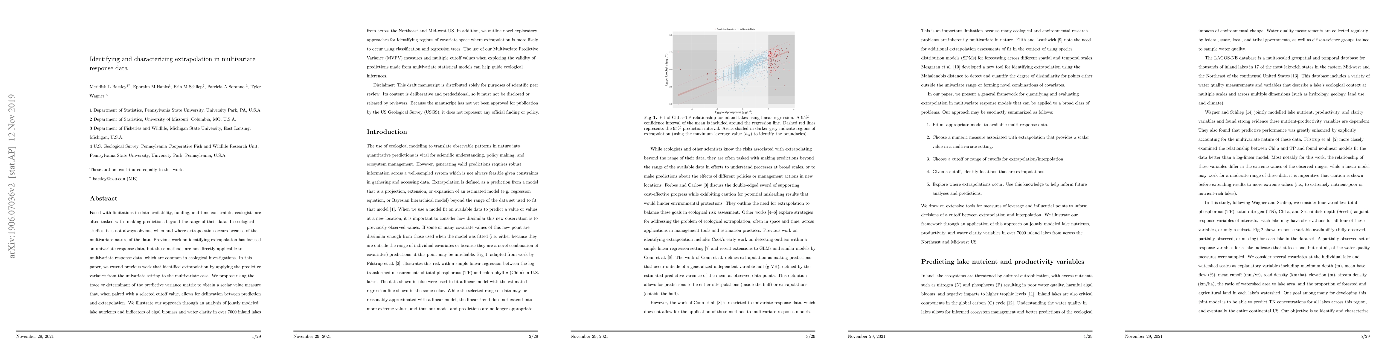 Extrapolation is defined as making predictions beyond the range of the data used to estimate a statistical model. In ecological studies, it is not always obvious when and where extrapolation occurs because of the multivariate nature of the data. Previous work on identifying extrapolation has focused on univariate response data, but these methods are not directly applicable to multivariate response data, which are more and more common in ecological investigations. In this paper, we extend previous work that identified extrapolation by applying the predictive variance from the univariate setting to the multivariate case. We illustrate our approach through an analysis of jointly modeled lake nutrients and indicators of algal biomass and water clarity in over 7000 inland lakes from across the Northeast and Mid-west US. In addition, we illustrate novel exploratory approaches for identifying regions of covariate space where extrapolation is more likely to occur using classification and regression trees.