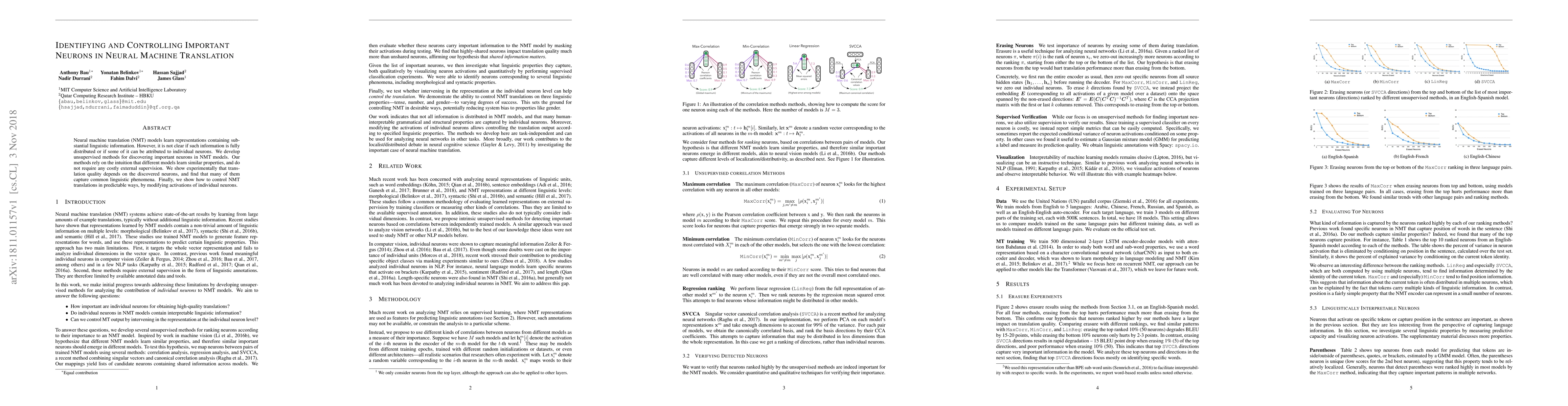 Neural machine translation (NMT) models learn representations containing substantial linguistic information. However, it is not clear if such information is fully distributed or if some of it can be attributed to individual neurons. We develop unsupervised methods for discovering important neurons in NMT models. Our methods rely on the intuition that different models learn similar properties, and do not require any costly external supervision. We show experimentally that translation quality depends on the discovered neurons, and find that many of them capture common linguistic phenomena. Finally, we show how to control NMT translations in predictable ways, by modifying activations of individual neurons.