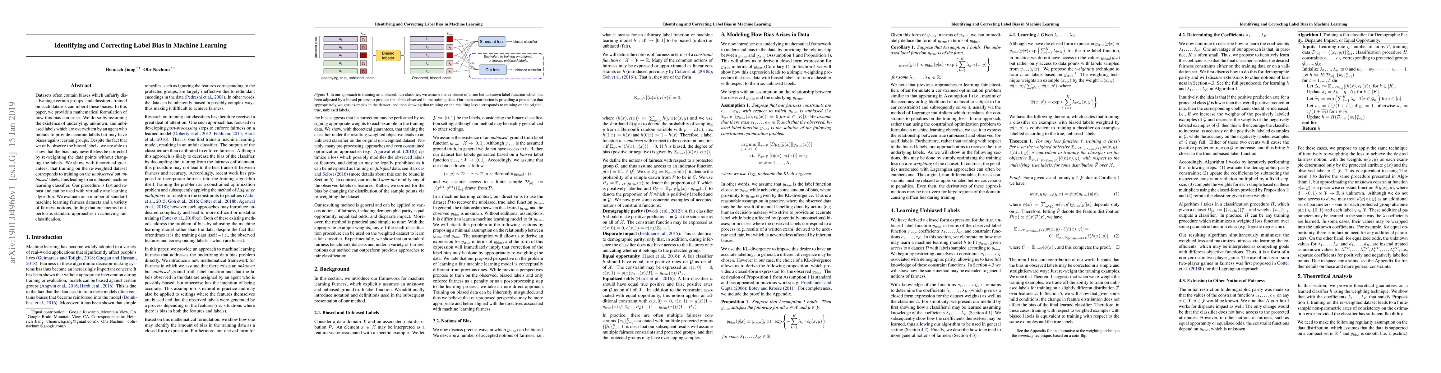 Researchers developed a method to correct label bias in machine learning models by re-weighting biased data points without changing the labels, achieving unbiased classifiers with theoretical guarantees. Their approach outperforms standard fairness methods in multiple datasets.