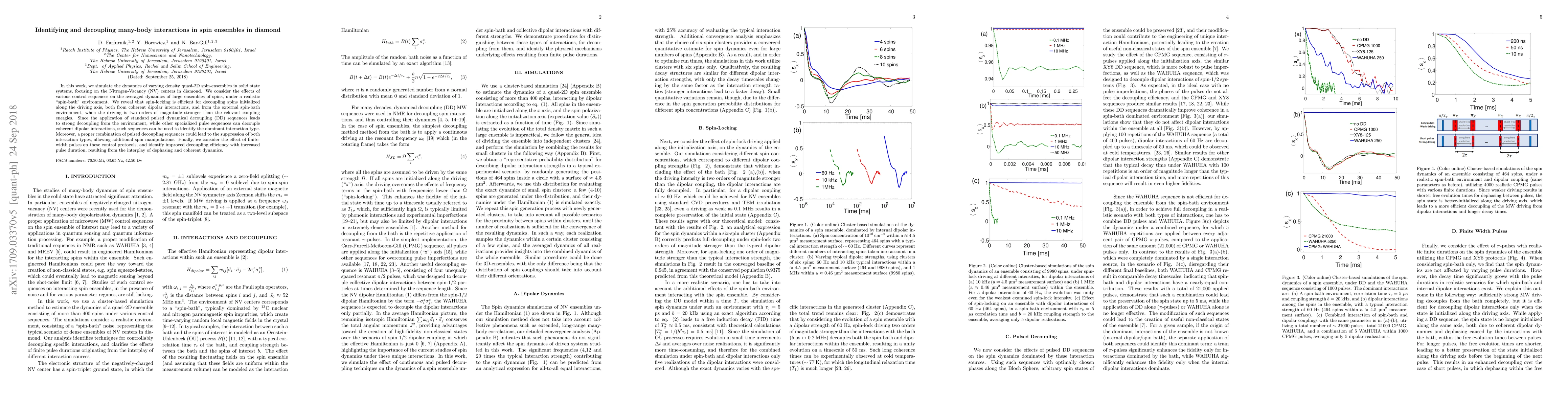 This paper investigates the dynamics of spin ensembles in nitrogen-vacancy centers in diamond, demonstrating that spin locking effectively decouples spins from both coherent dipolar interactions and the spin-bath environment when the driving strength is significantly higher than coupling energies. It proposes specialized pulse sequences for identifying and decoupling different interaction types, and finds improved decoupling efficiency with longer pulse durations.
